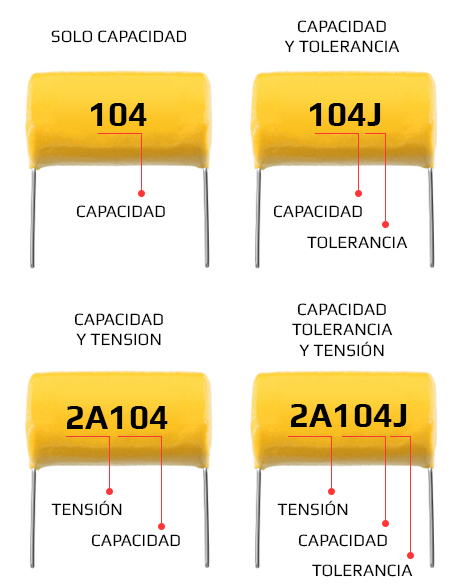 Escriba en el centro del capacitor el código sin espacios intermedios y presione la flecha hacia abajo para obtener los valores de capacidad, tolerancia y tensión máxima de trabajo.