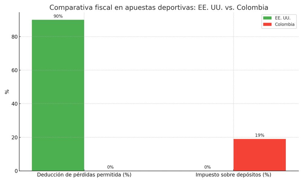 En Colombia se grava incluso el ingreso antes de jugar, y no se reconoce ninguna deducción por pérdida, a diferencia del modelo norteamericano. Deducción de pérdidas permitida: EE. UU.: 90 % -Colombia: 0 % /Impuesto sobre depósitos: EE. UU.: 0 % - Colombia: 19 %