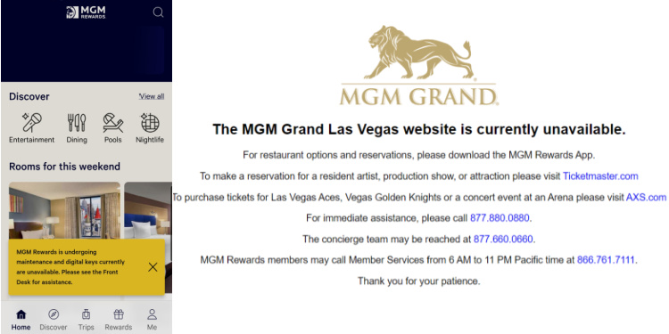Los sitios web de los 31 complejos turísticos de MGM, incluida la docena ubicada directamente en el Strip de Las Vegas, también han estado caídos desde el lunes, así como la aplicación móvil de recompensas de la compañía, lo que ha dejado al personal de recepción luchando por acomodar a los huéspedes malhumorados que han estado publicando constantemente en redes sociales durante toda la prueba.