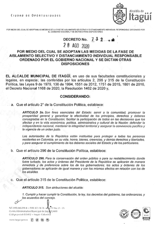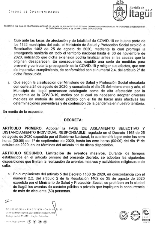 Siguiendo los lineamientos del decreto nacional 1168 del 25 de agosto del 2020, donde el gobierno nacional le da luz verde al sector de juegos de suerte y azar para su reactivación nacional, y apoyando el reciente anuncio de reapertura total en Medellín, el Municipio de Itagüí bajo el decreto 732 del 28 de agosto de 2020 adopta las medidas establecidas por el gobierno y da la reapertura de casinos.