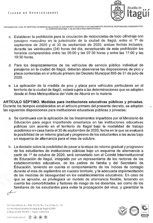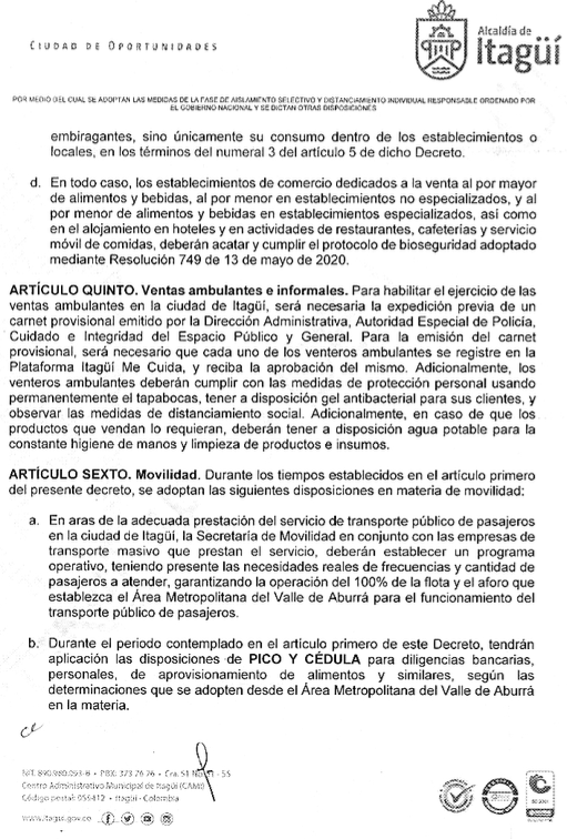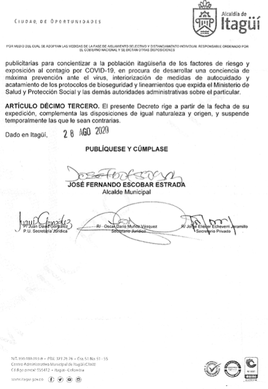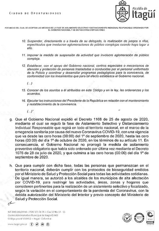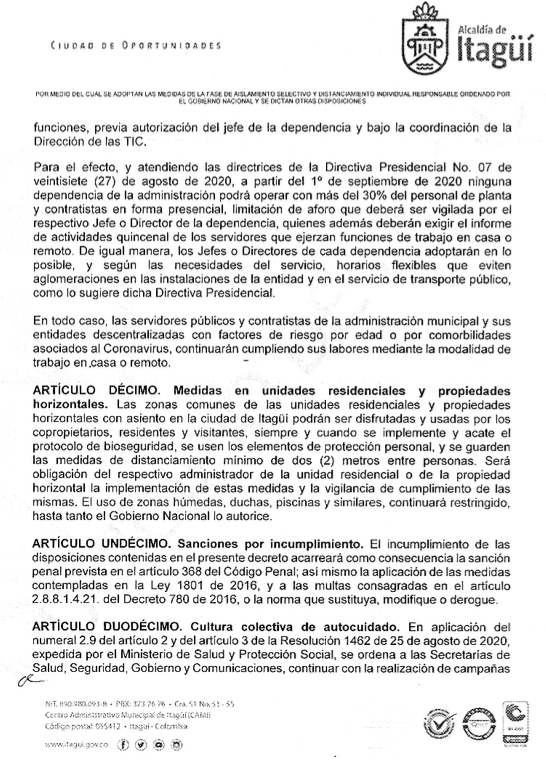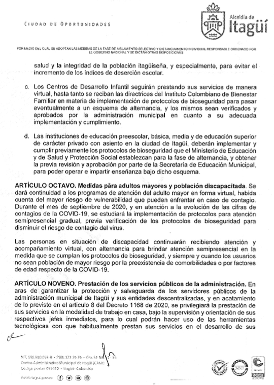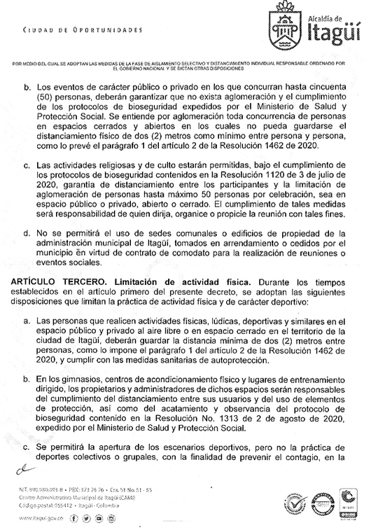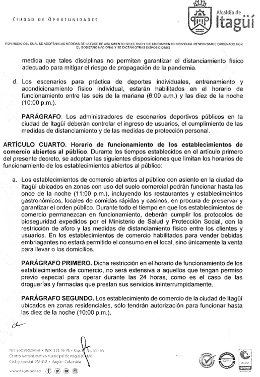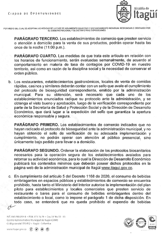 De esta forma, y cumpliendo las instrucciones de aislamiento selectivo y distanciamiento individual responsable. La alcaldía de Itagüí en el articulo número cuatro, establece que hasta el primero de octubre los casinos podrán funcionar hasta las 11:00 pm cumpliendo todos los protocolos de bioseguridad establecidos, incluyendo la no venta de bebidas embriagantes.