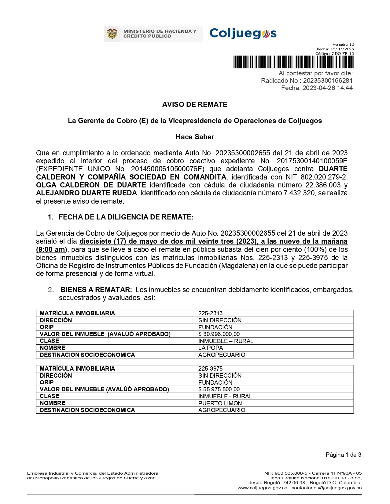 Así mismo Coljuegos subraya que “La subasta puÌblica comenzaraÌ a las nueve de la mañana (9:00 am), del diÌa diecisiete (17) de mayo de dos mil veinte tres (2023), y transcurrida una hora, se procederáÌ a la apertura de los sobres que contengan los requisitos exigidos en el CoÌdigo General del Proceso, entregándose el predio en el estado que se encuentra al momento del remate como cuerpo cierto”.