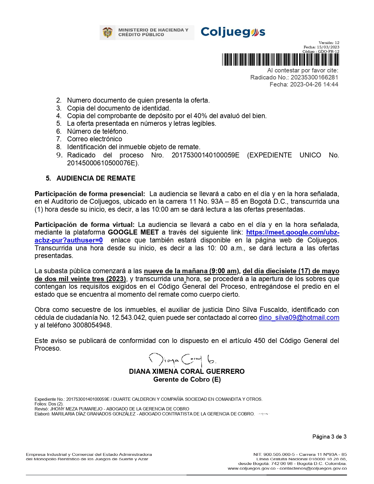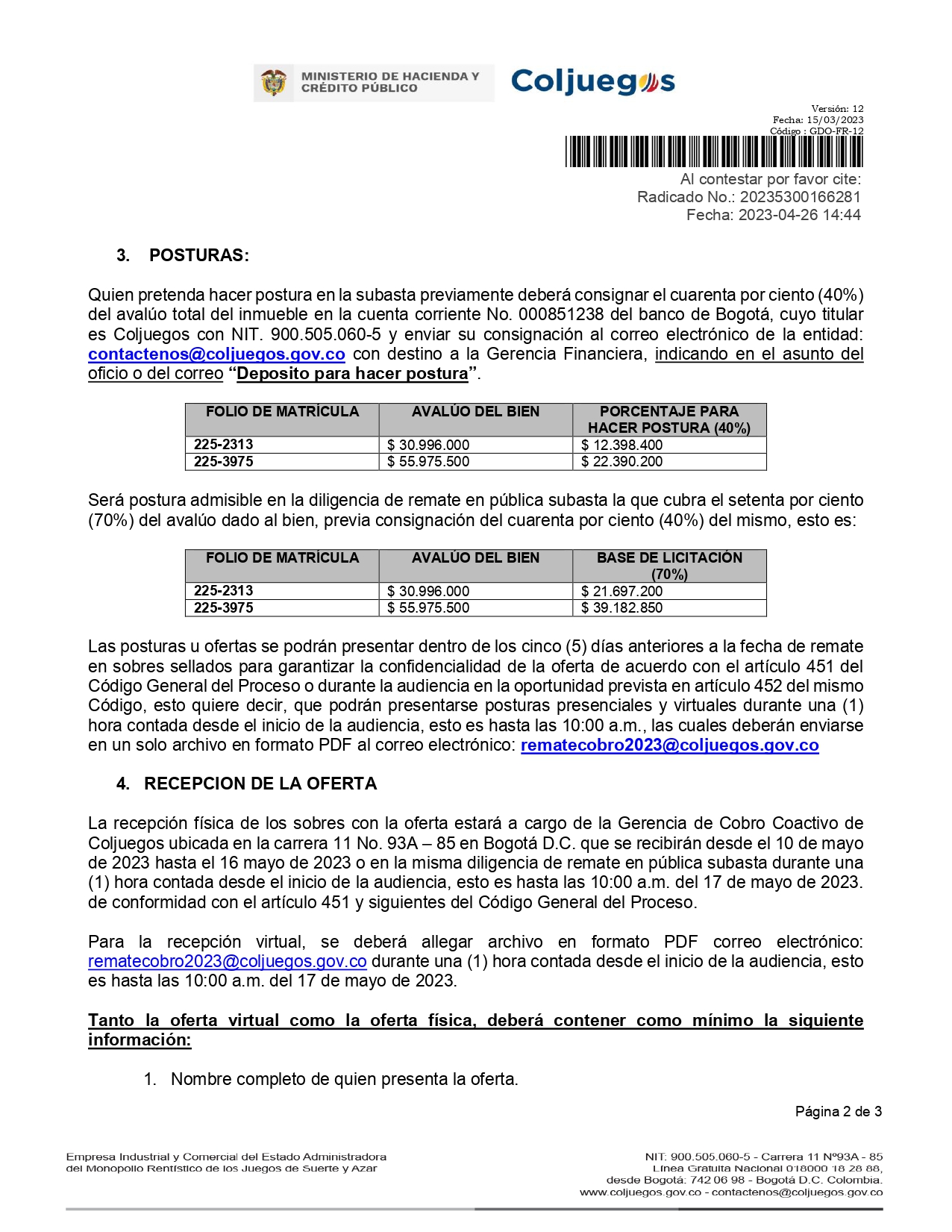 Coljuegos indicó que: “Las posturas u ofertas se podrán presentar dentro de los cinco (5) días anteriores a la fecha de remate en sobres sellados para garantizar la confidencialidad de la oferta de acuerdo con el artículo 451 del Código General del Proceso o durante la audiencia en la oportunidad prevista en artículo 452 del mismo Código, esto quiere decir, que podrán presentarse posturas presenciales y virtuales durante una (1) hora contada desde el inicio de la audiencia, esto es hasta las 10:00 a.m.”