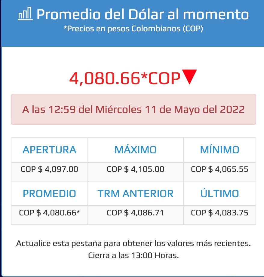El precio del dólar en Colombia para este miércoles 11 de mayo de 2022 es de COP $ 4,083.75 pesos colombianos, según datos de Reuters.