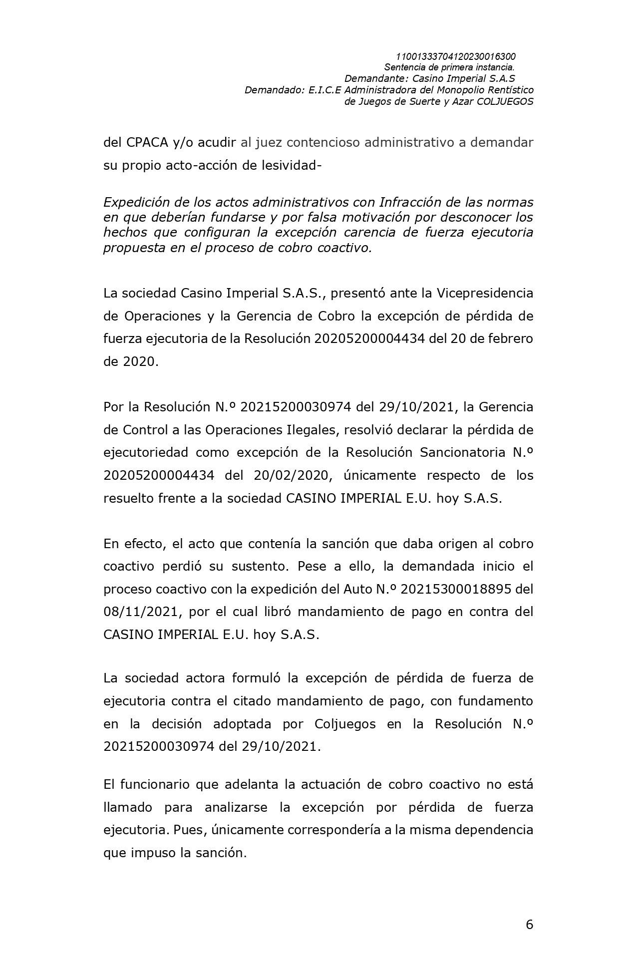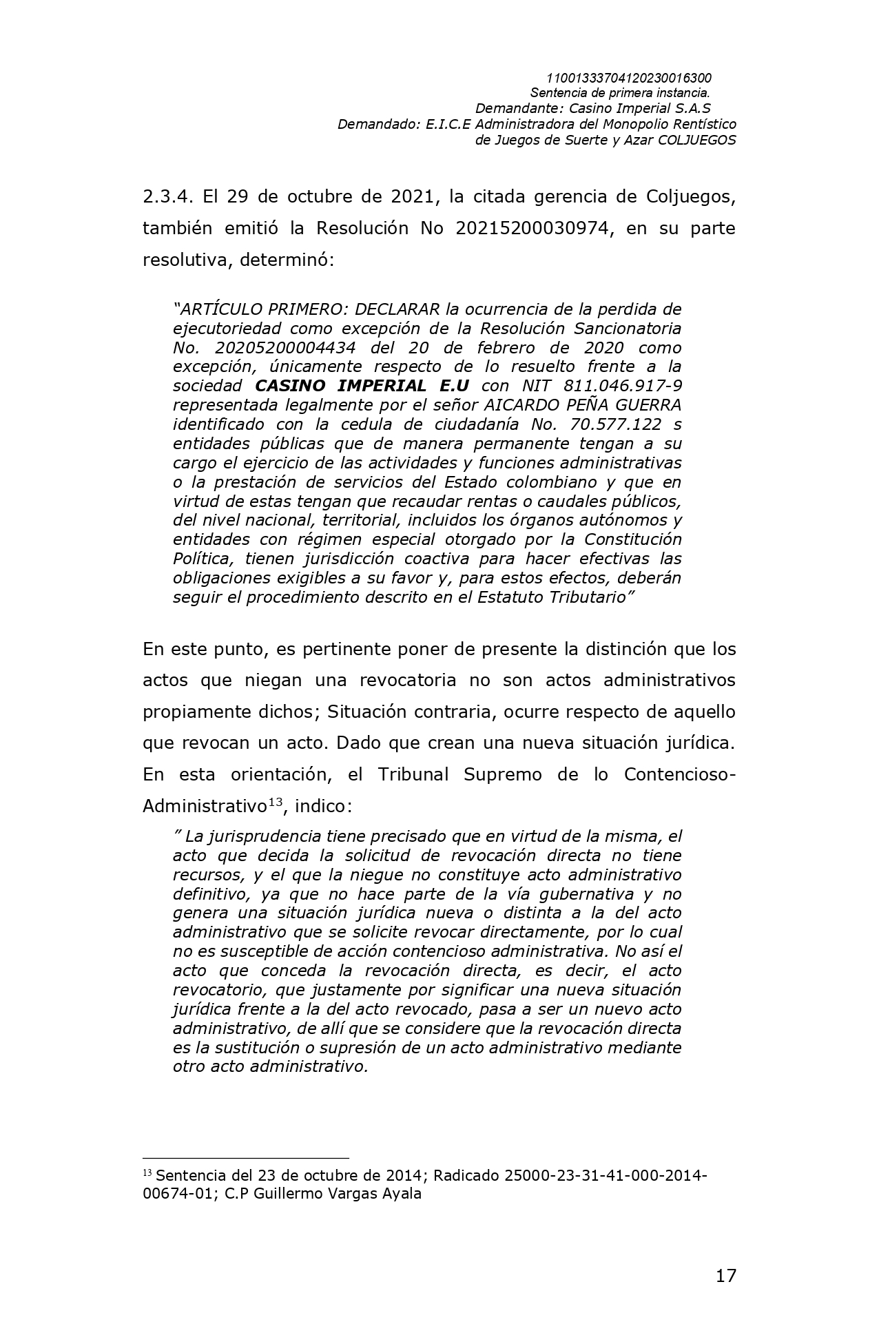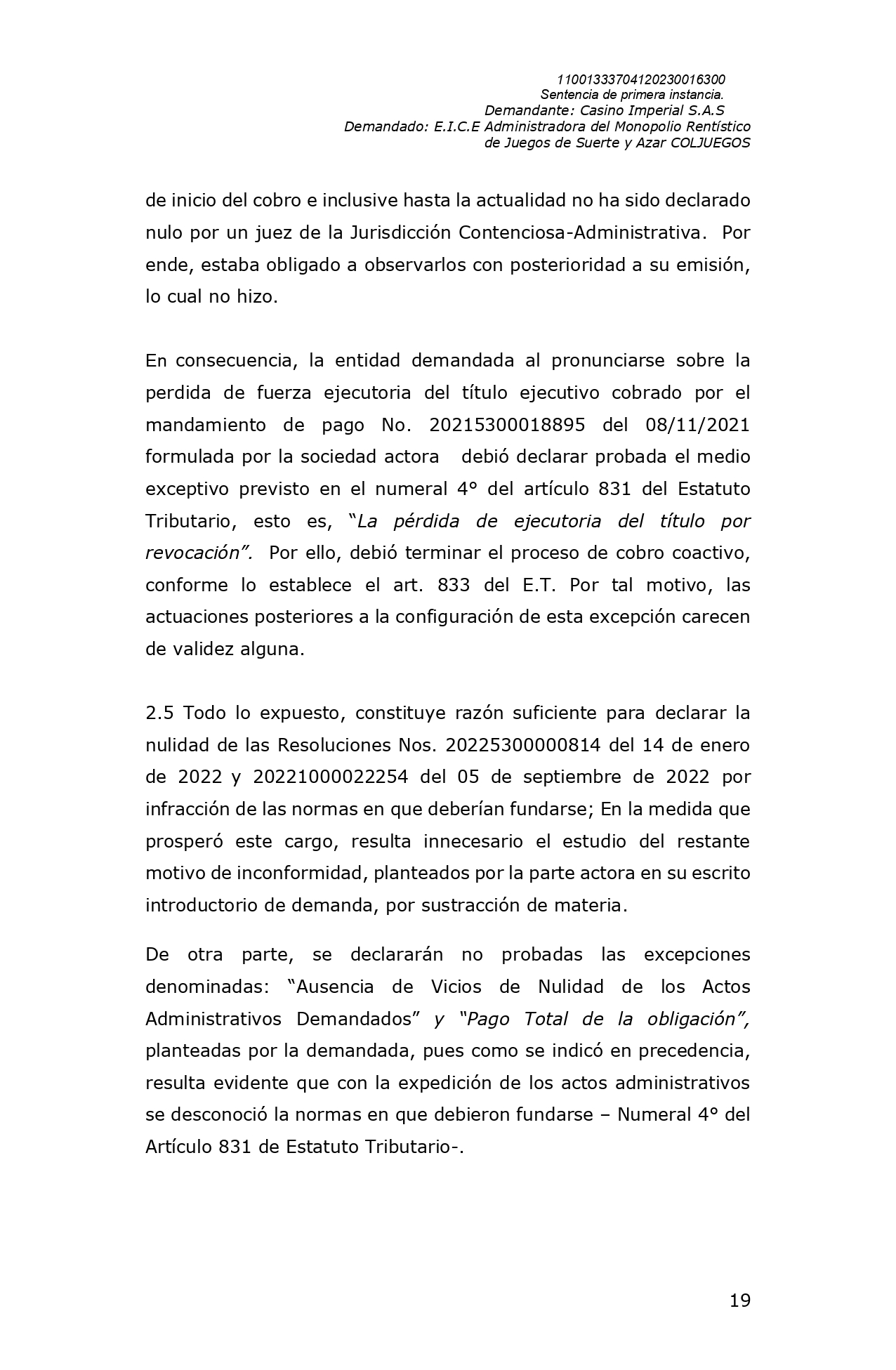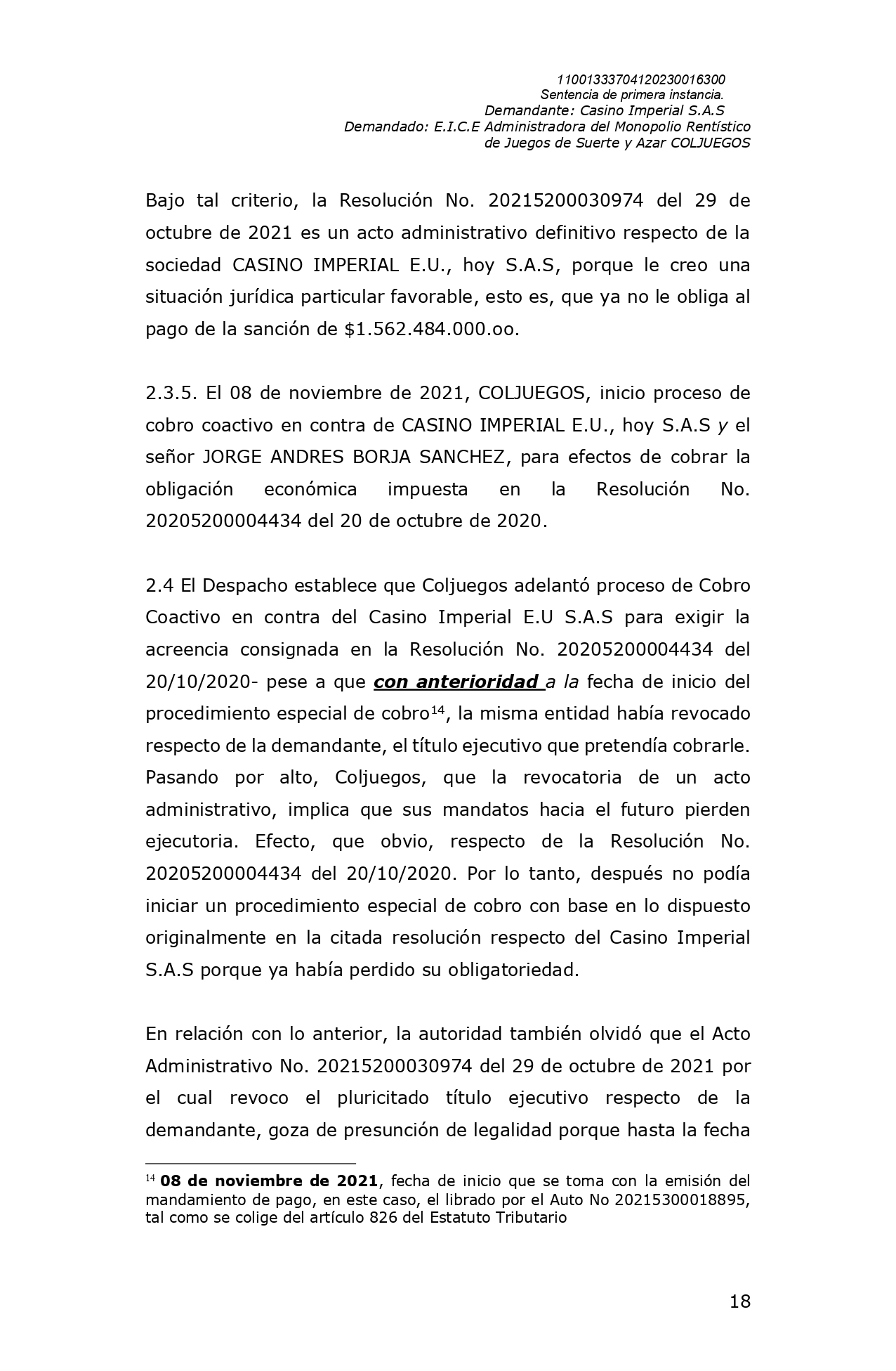 El Despacho estableció que Coljuegos adelantó proceso de Cobro Coactivo en contra del Casino Imperial E.U S.A.S para exigir la acreencia consignada en la Resolución No. 20205200004434 del 20/10/2020- pese a que con anterioridad a la fecha de inicio del procedimiento especial de cobro, la misma entidad había revocado respecto de la demandante, el título ejecutivo que pretendía cobrarle.