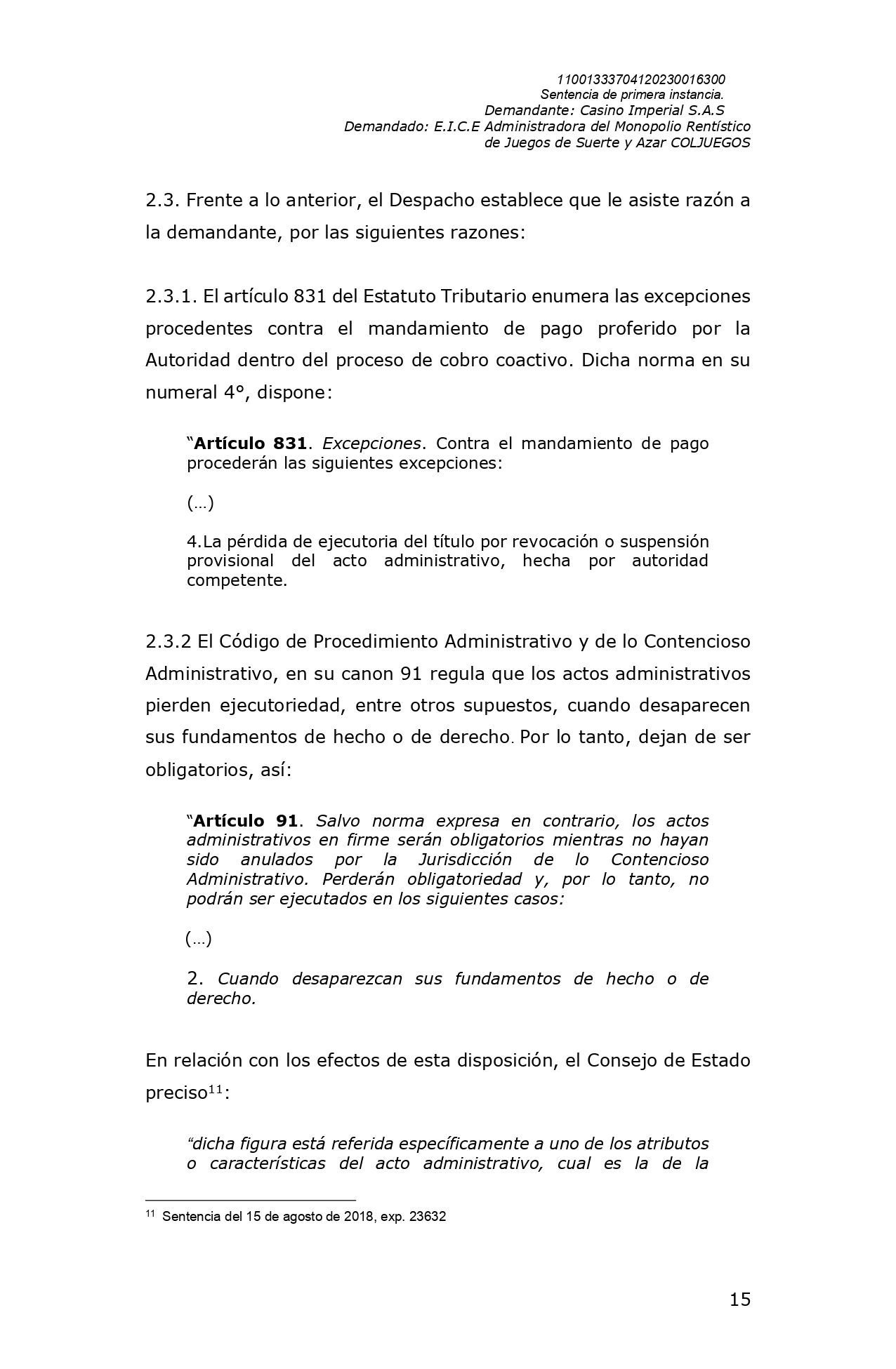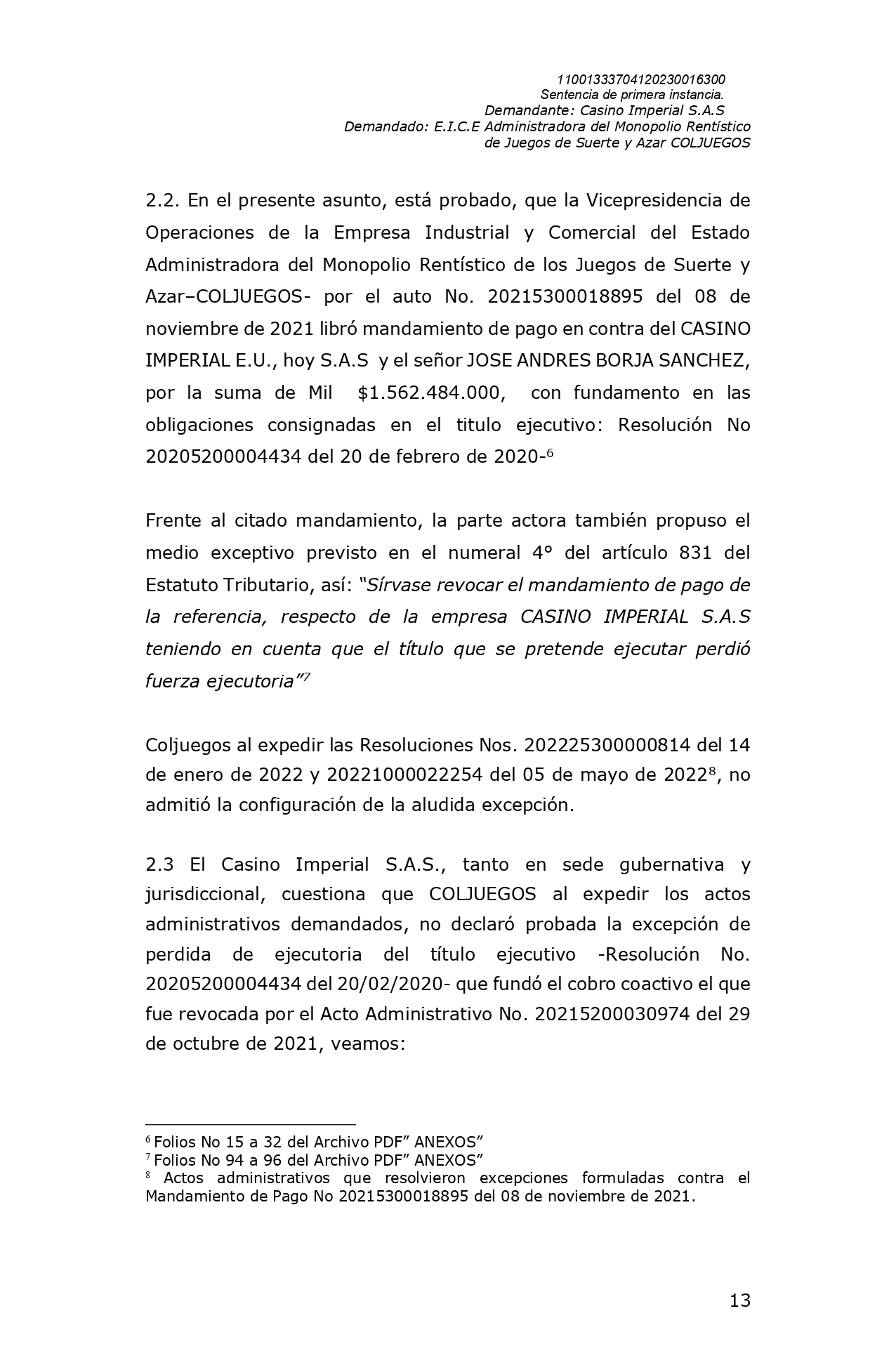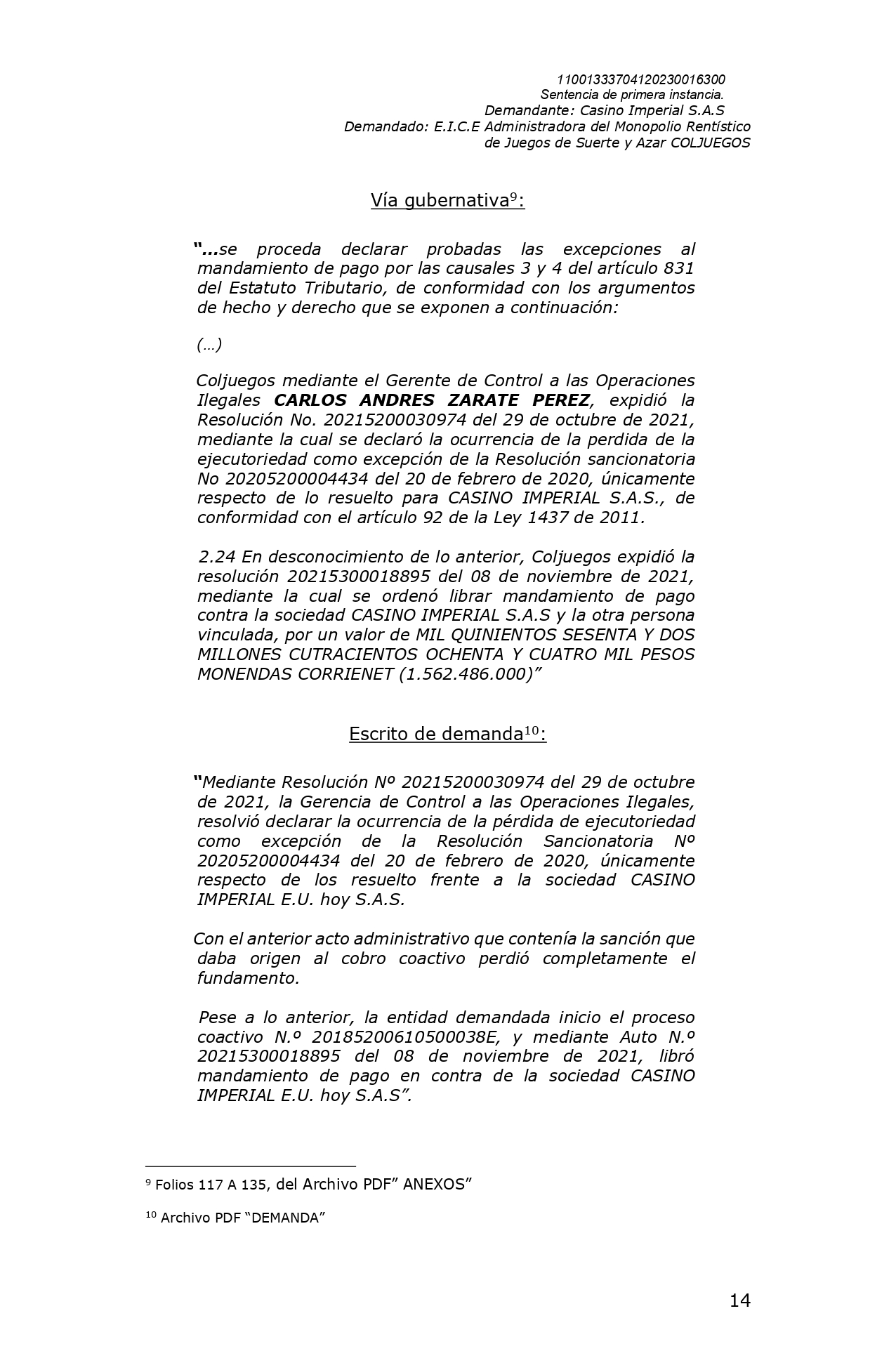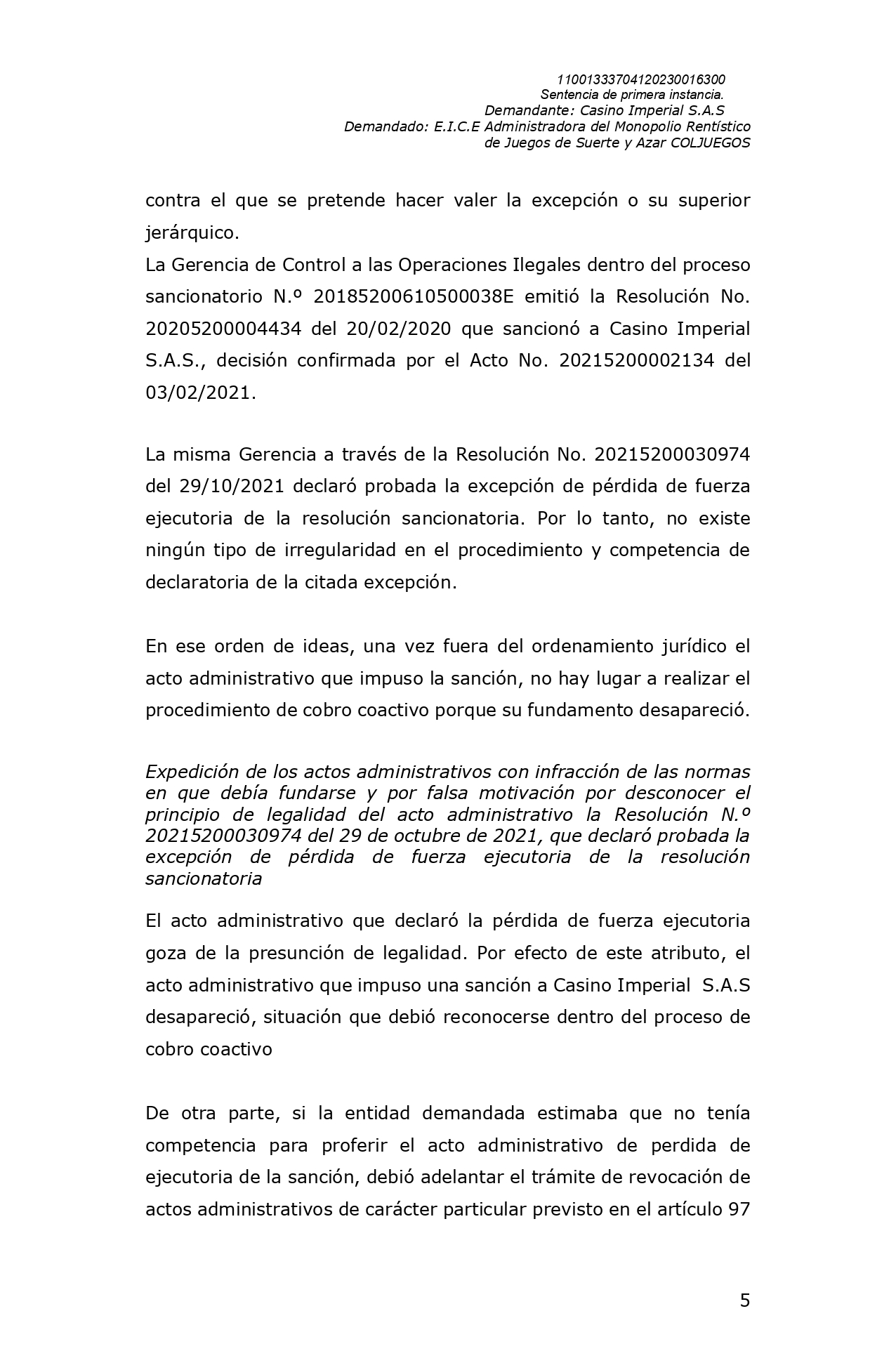 El Despacho estableció que Coljuegos adelantó proceso de Cobro Coactivo en contra del Casino Imperial E.U S.A.S para exigir la acreencia consignada en la Resolución No. 20205200004434 del 20/10/2020- pese a que con anterioridad a la fecha de inicio del procedimiento especial de cobro, la misma entidad había revocado respecto de la demandante, el título ejecutivo que pretendía cobrarle.