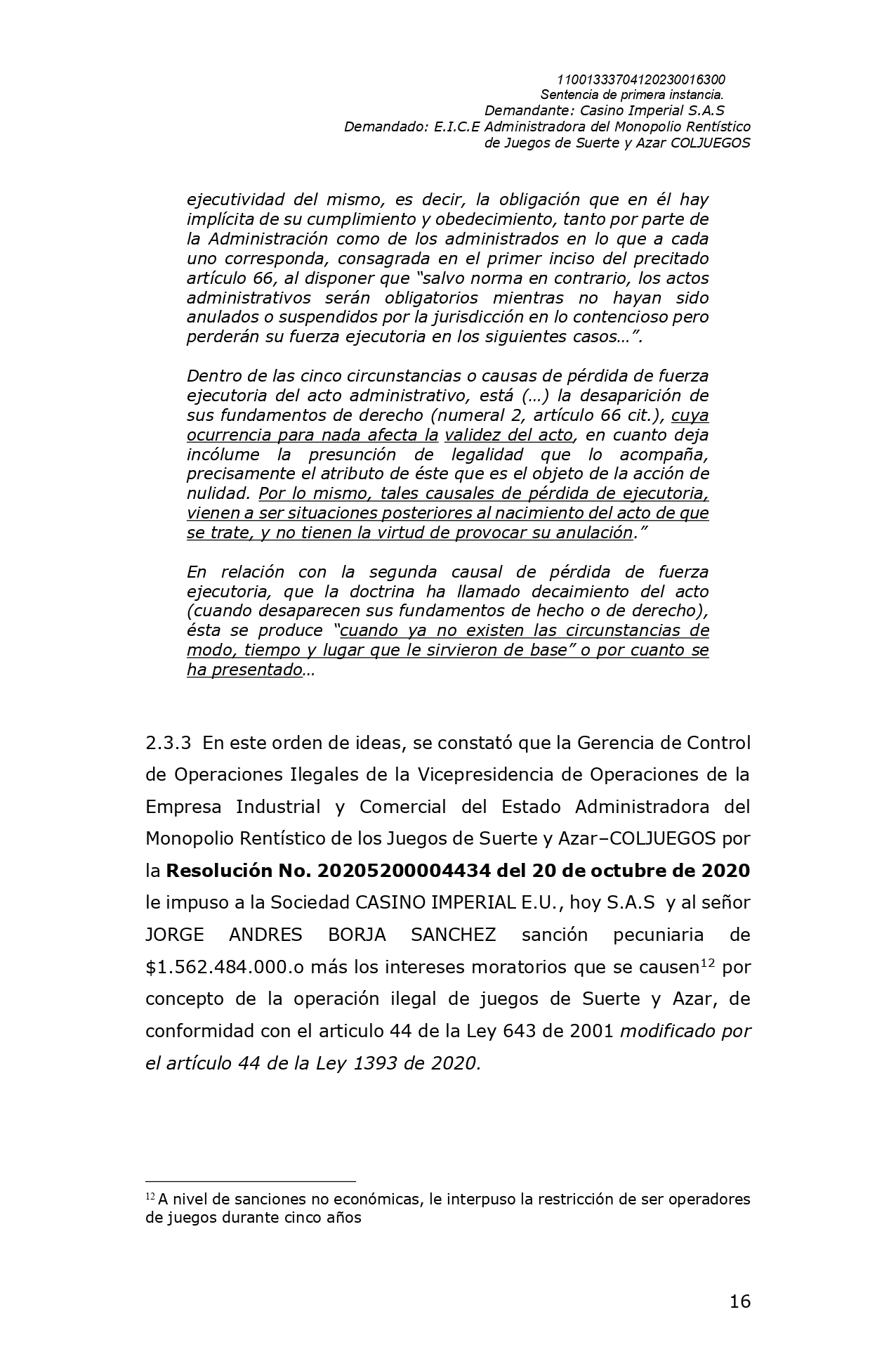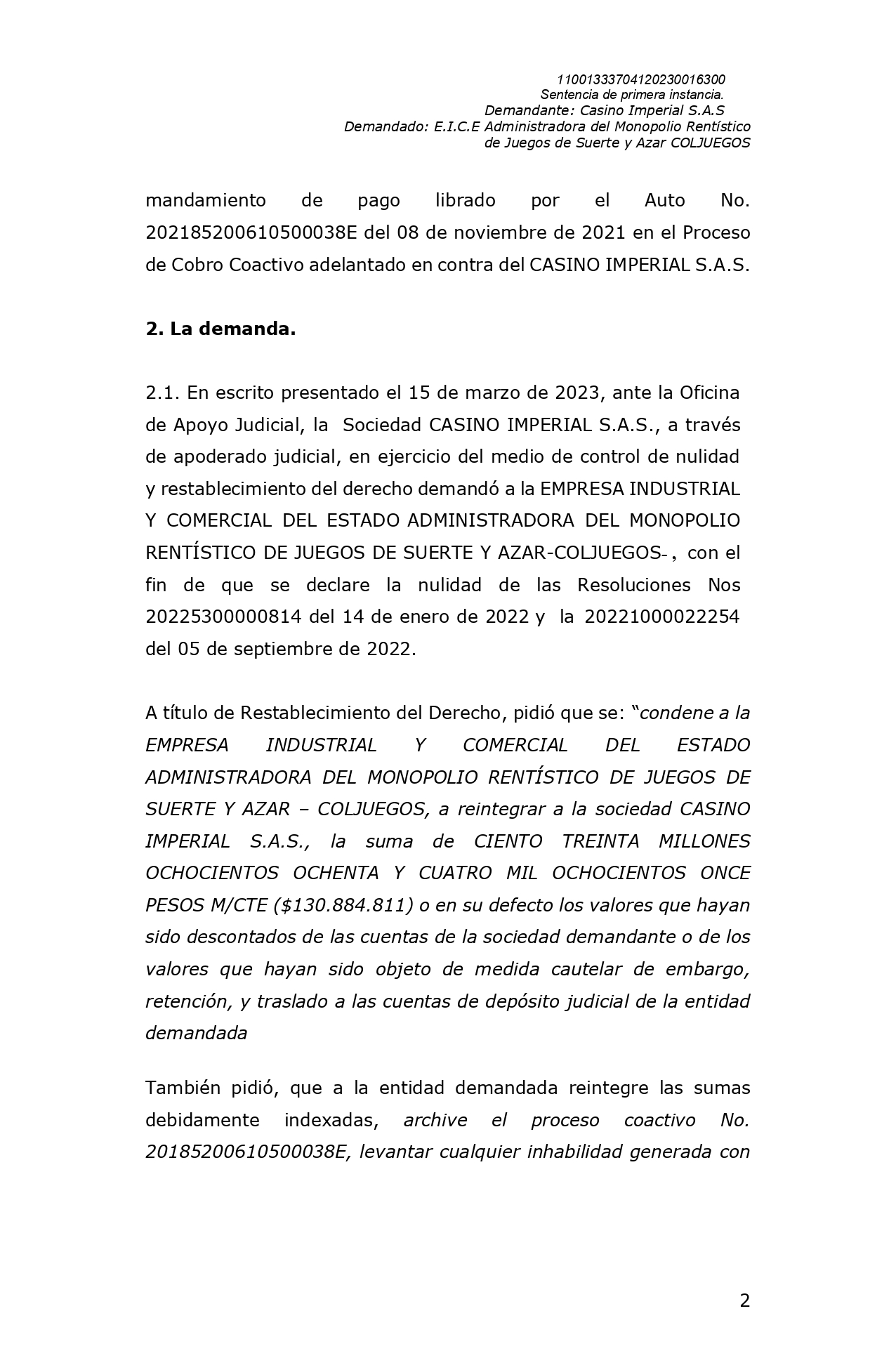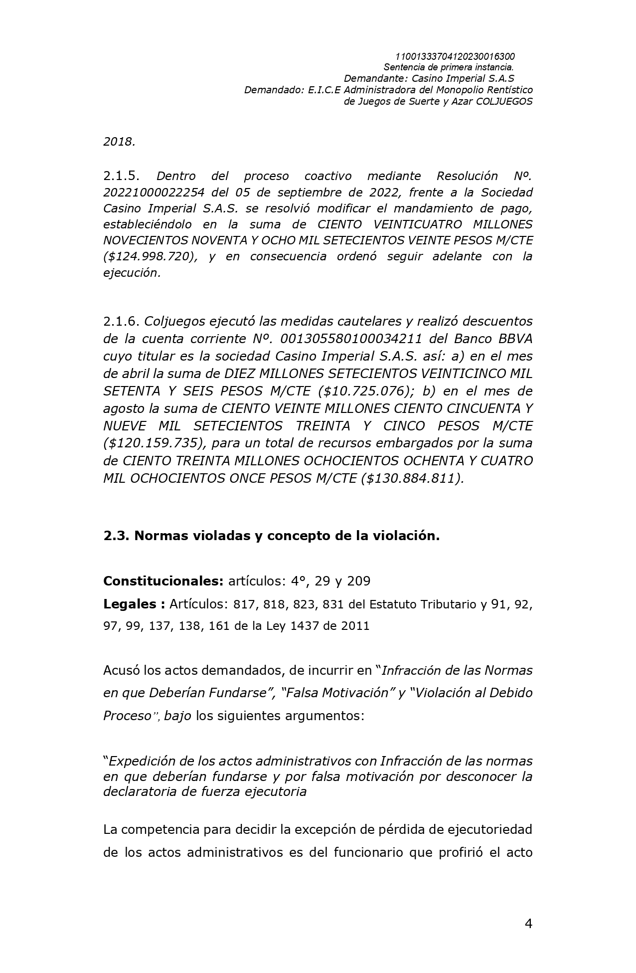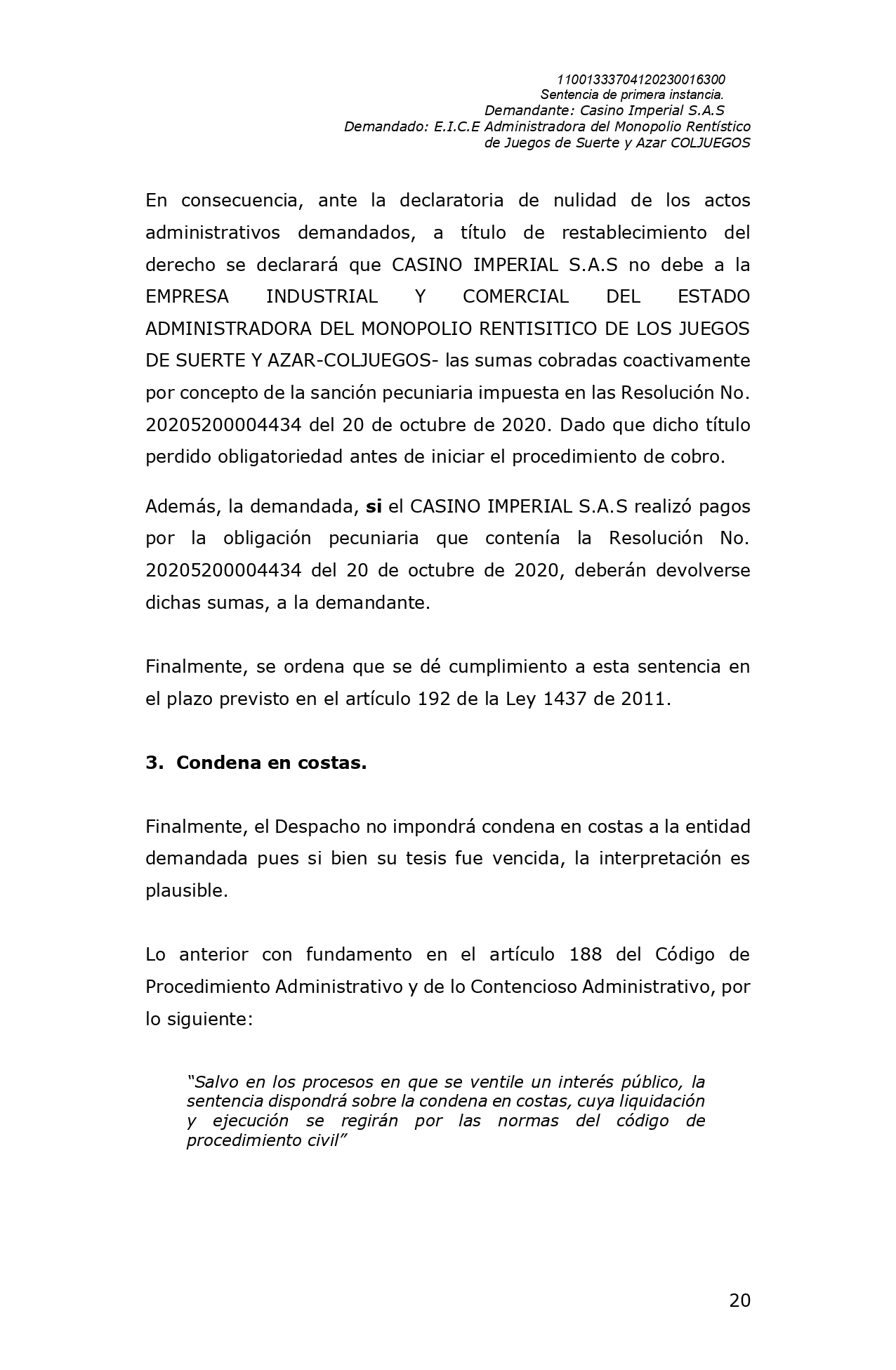 El Despacho estableció que Coljuegos adelantó proceso de Cobro Coactivo en contra del Casino Imperial E.U S.A.S para exigir la acreencia consignada en la Resolución No. 20205200004434 del 20/10/2020- pese a que con anterioridad a la fecha de inicio del procedimiento especial de cobro, la misma entidad había revocado respecto de la demandante, el título ejecutivo que pretendía cobrarle.