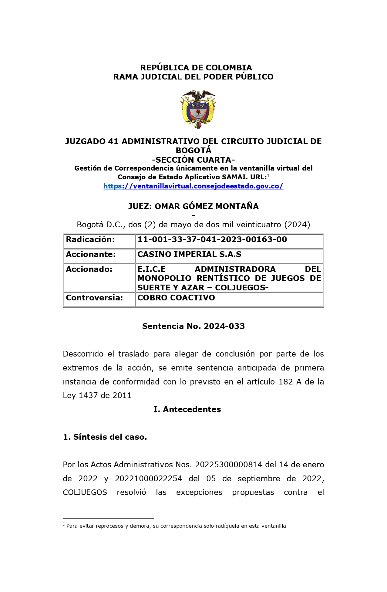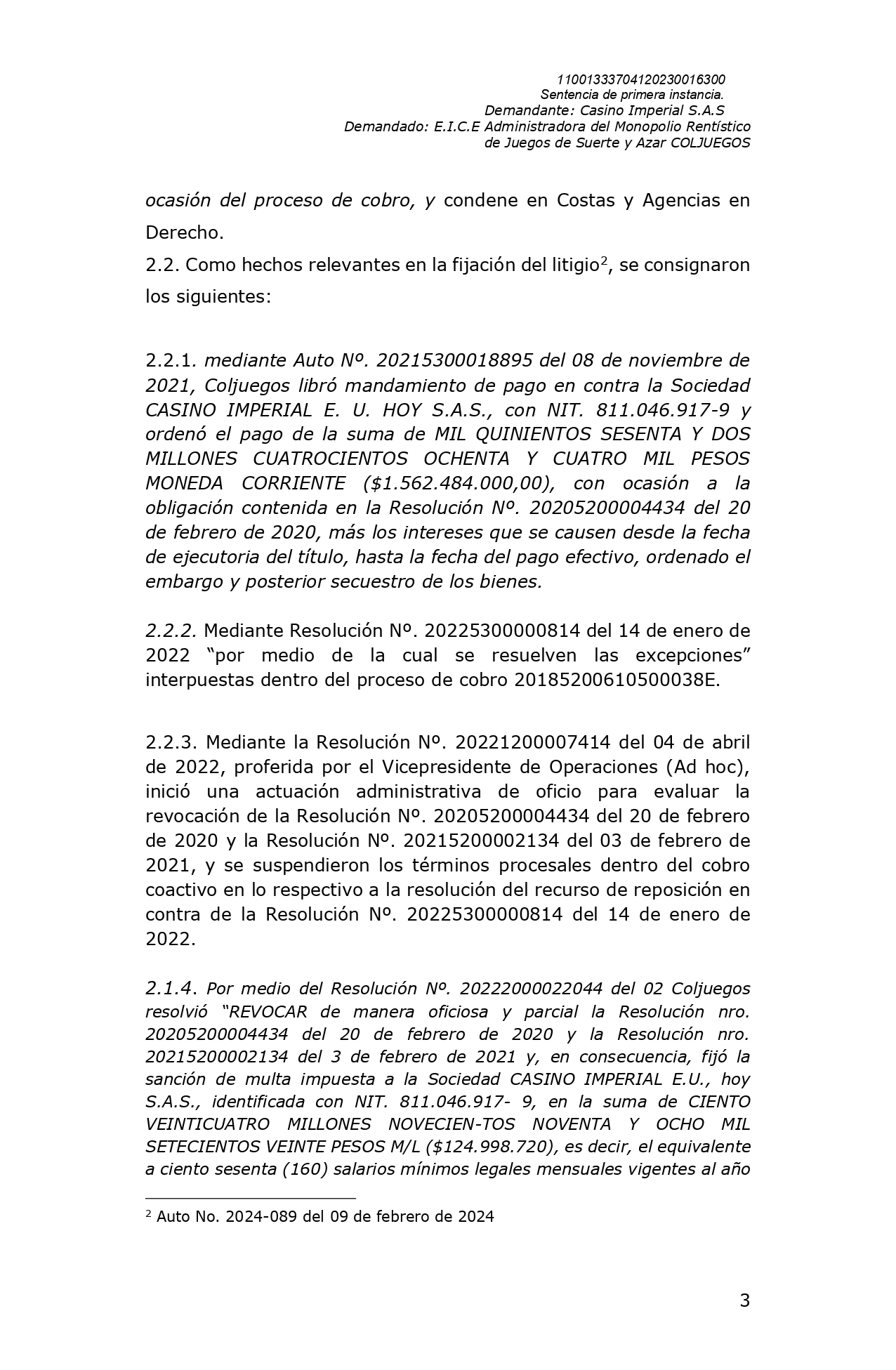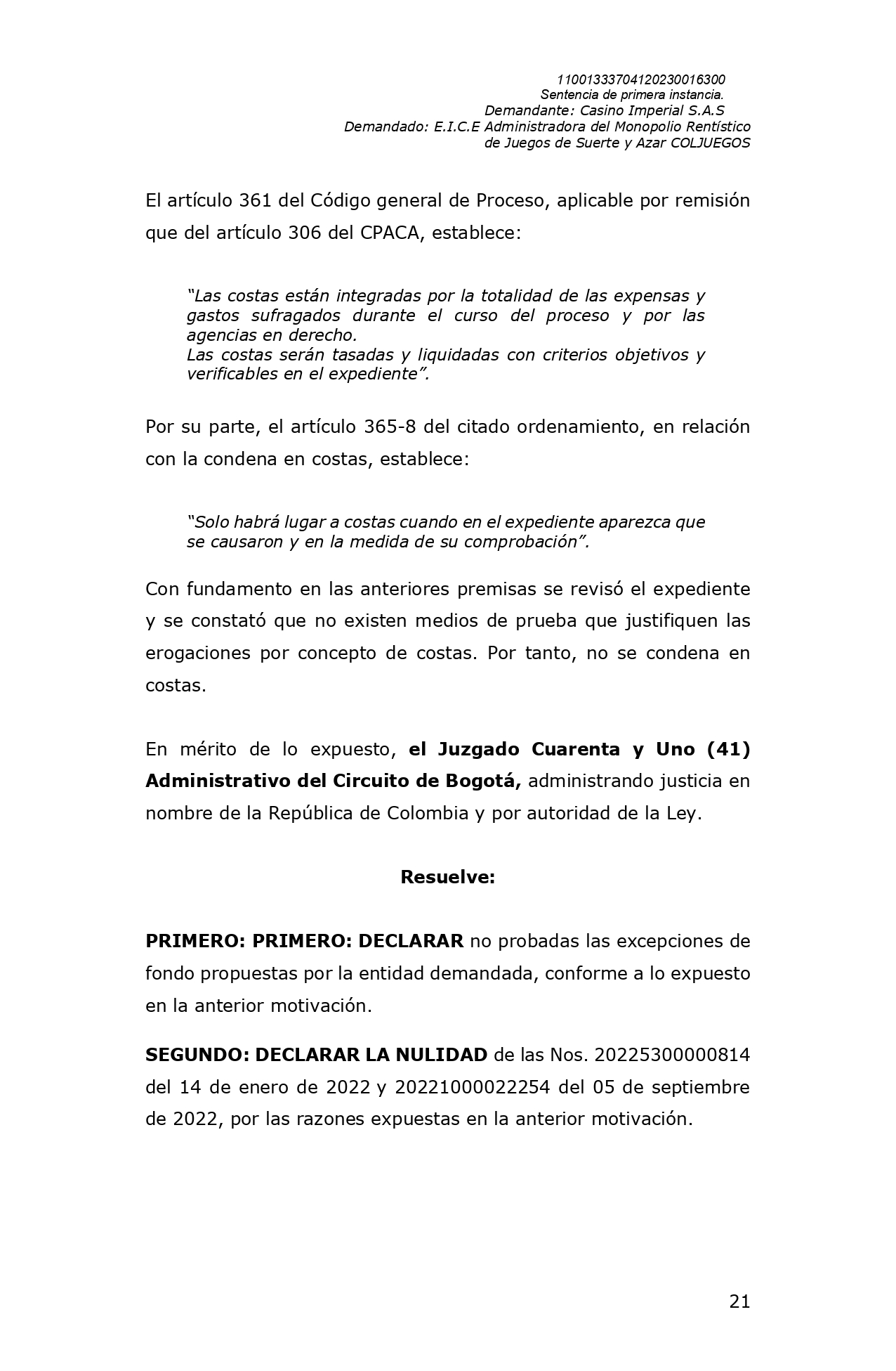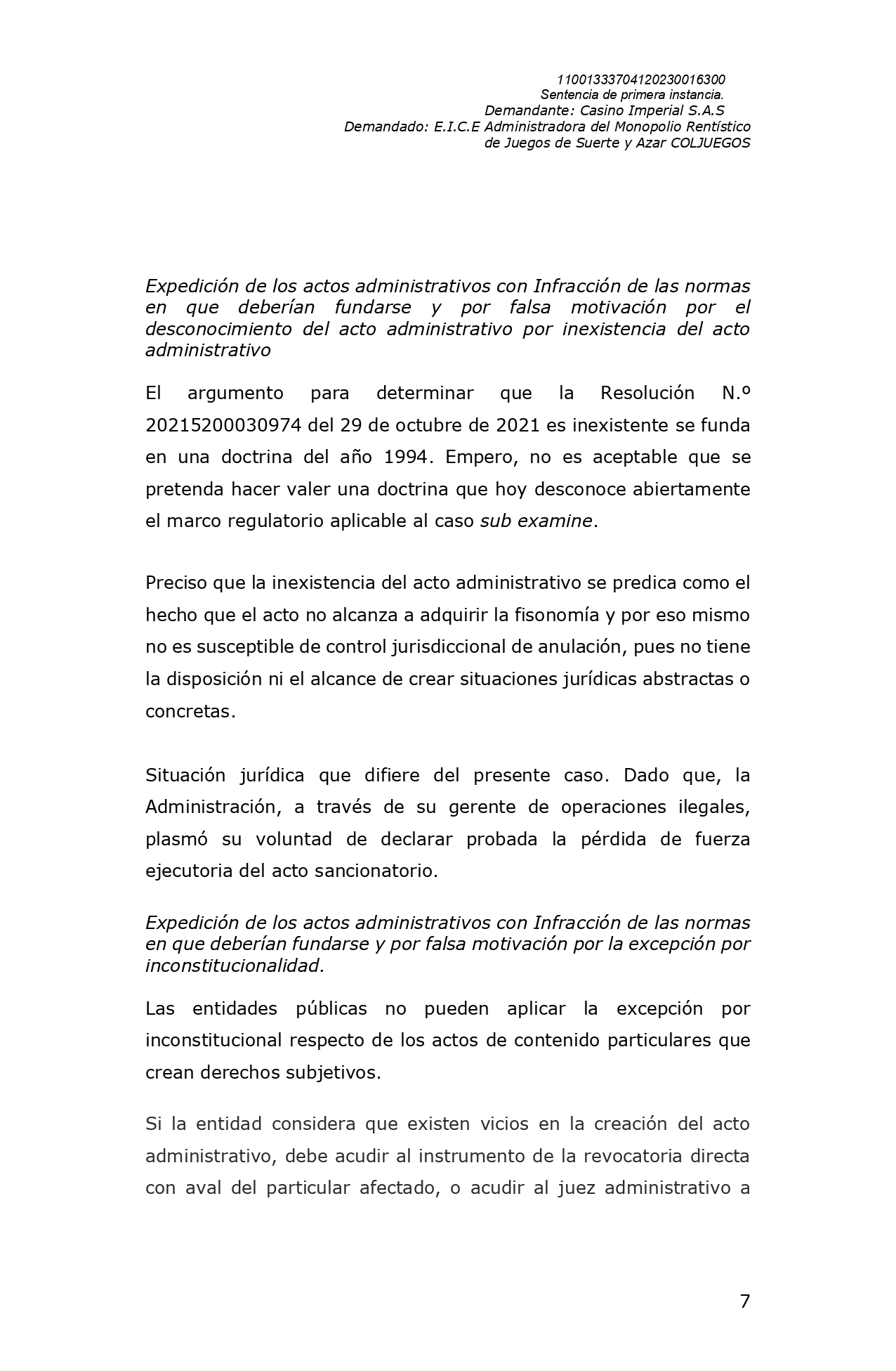 El Despacho estableció que Coljuegos adelantó proceso de Cobro Coactivo en contra del Casino Imperial E.U S.A.S para exigir la acreencia consignada en la Resolución No. 20205200004434 del 20/10/2020- pese a que con anterioridad a la fecha de inicio del procedimiento especial de cobro, la misma entidad había revocado respecto de la demandante, el título ejecutivo que pretendía cobrarle.