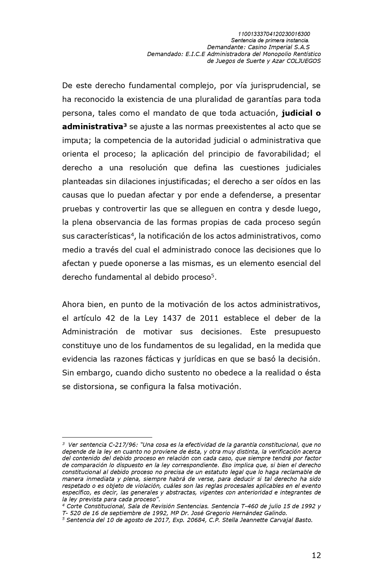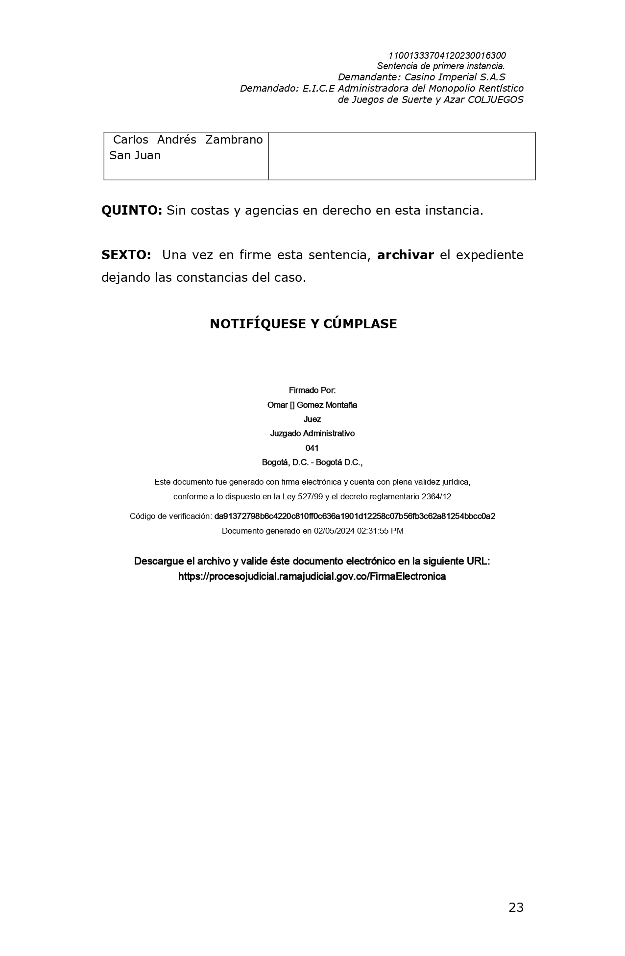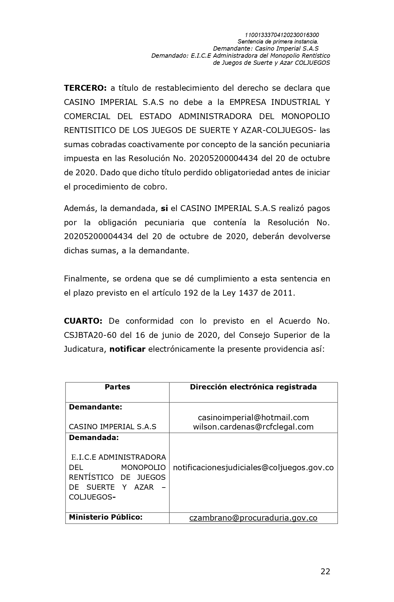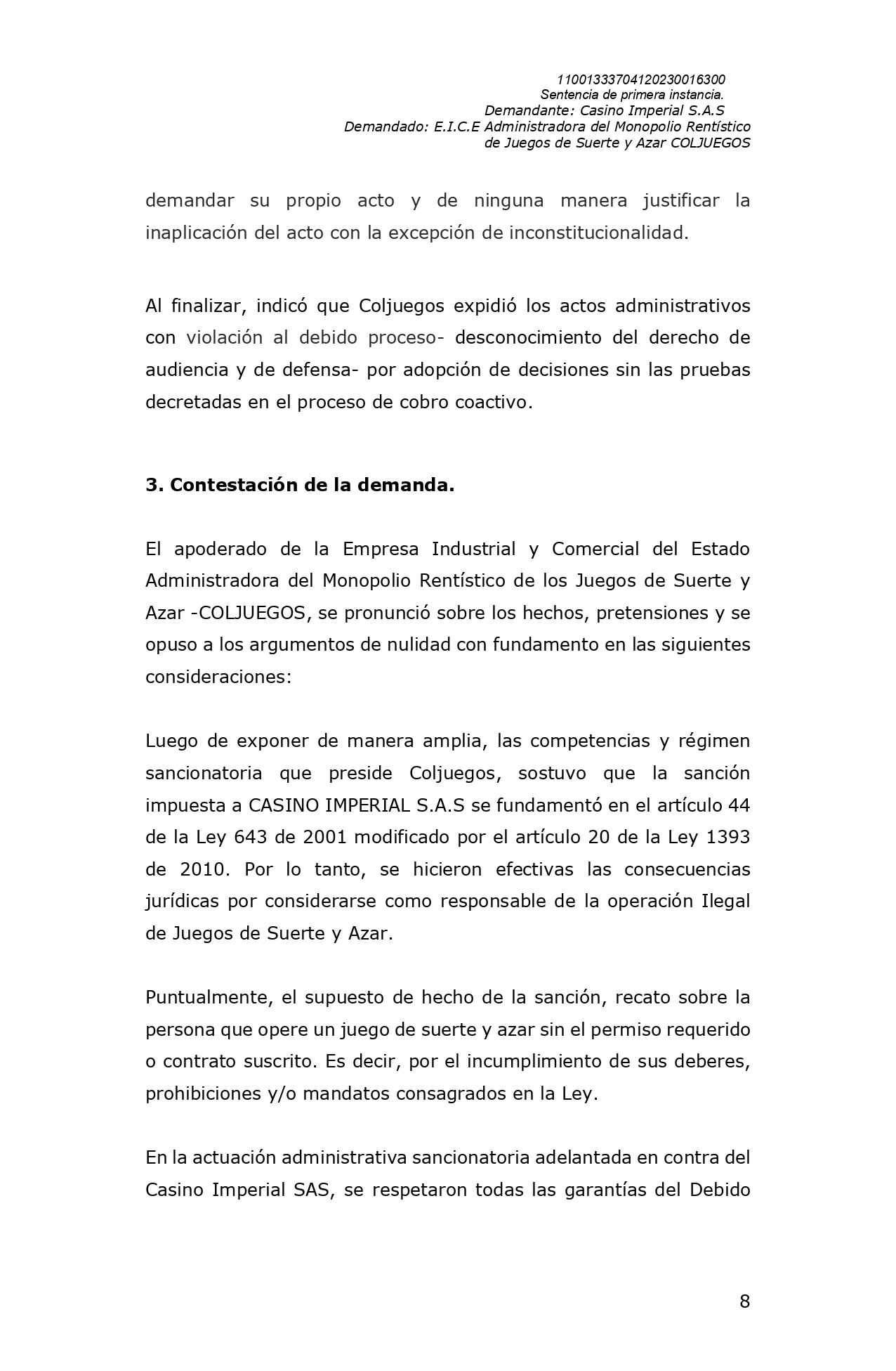 La demanda fue llevada hasta su finalización por el Bufete de Abogados Rojas Conde & Cárdenas, quienes tienen una trayectoria de litigios en contra de Coljuegos, como el que presentara ante el Juzgado Único Administrativo de San Andrés Providencia y Santa Catalina que admitió demanda contra COLJUEGOS, en la que se discutía la presunta imposición abusiva de una sanción a un operador de juegos localizados: al parecer Coljuegos habría hecho efectiva la cláusula penal y por la mora en el pago de la misma, generado una sanción conminatoria , lo que obligó a Coljuegos a aceptar que había cometido errores en la imposición de la sanción por operación ilegal, revocando la misma, disminuyendo a menos del 10% y reconociendo los daños generados.