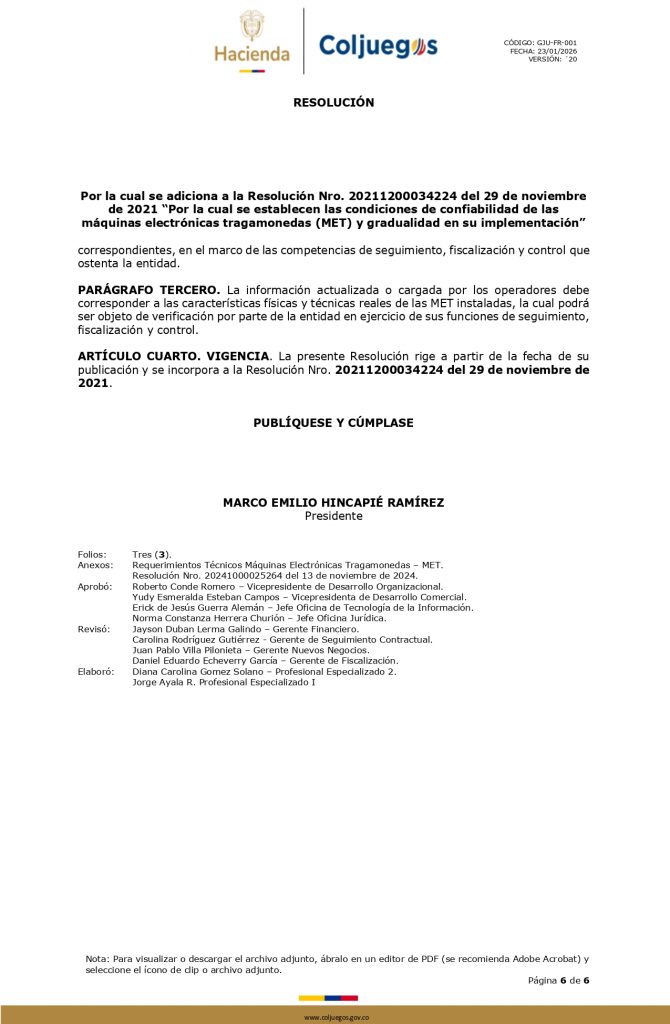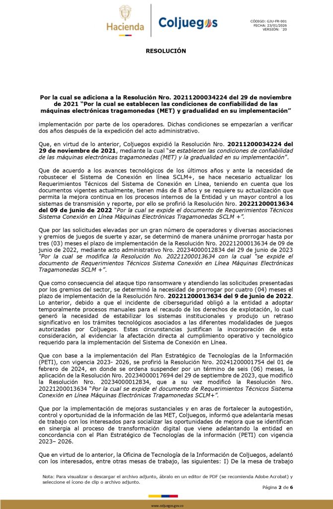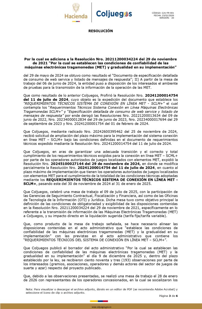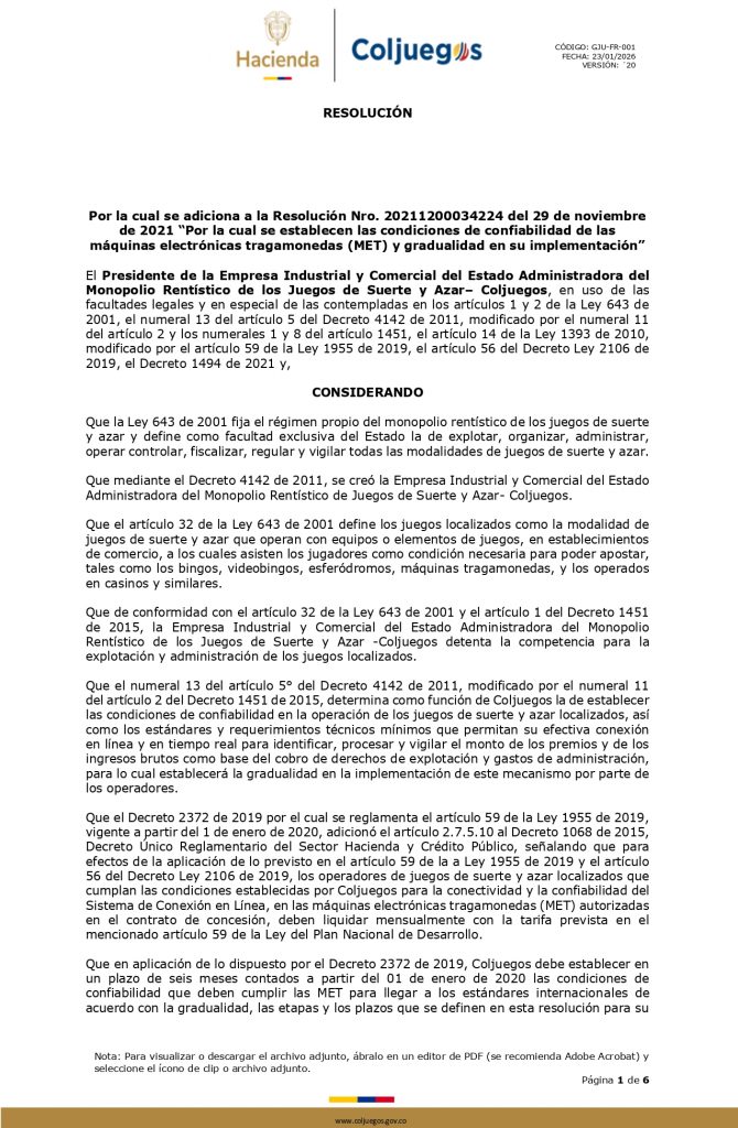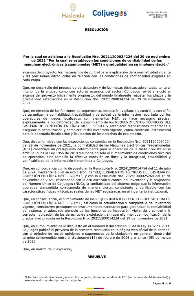Coljuegos publicó un proyecto de resolución que adiciona la Resolución 20211200034224 del 29 de noviembre de 2021, con el fin de precisar obligaciones operativas y de reporte alrededor de la confiabilidad de las Máquinas Electrónicas Tragamonedas (MET) y su relación directa con la fiscalización.