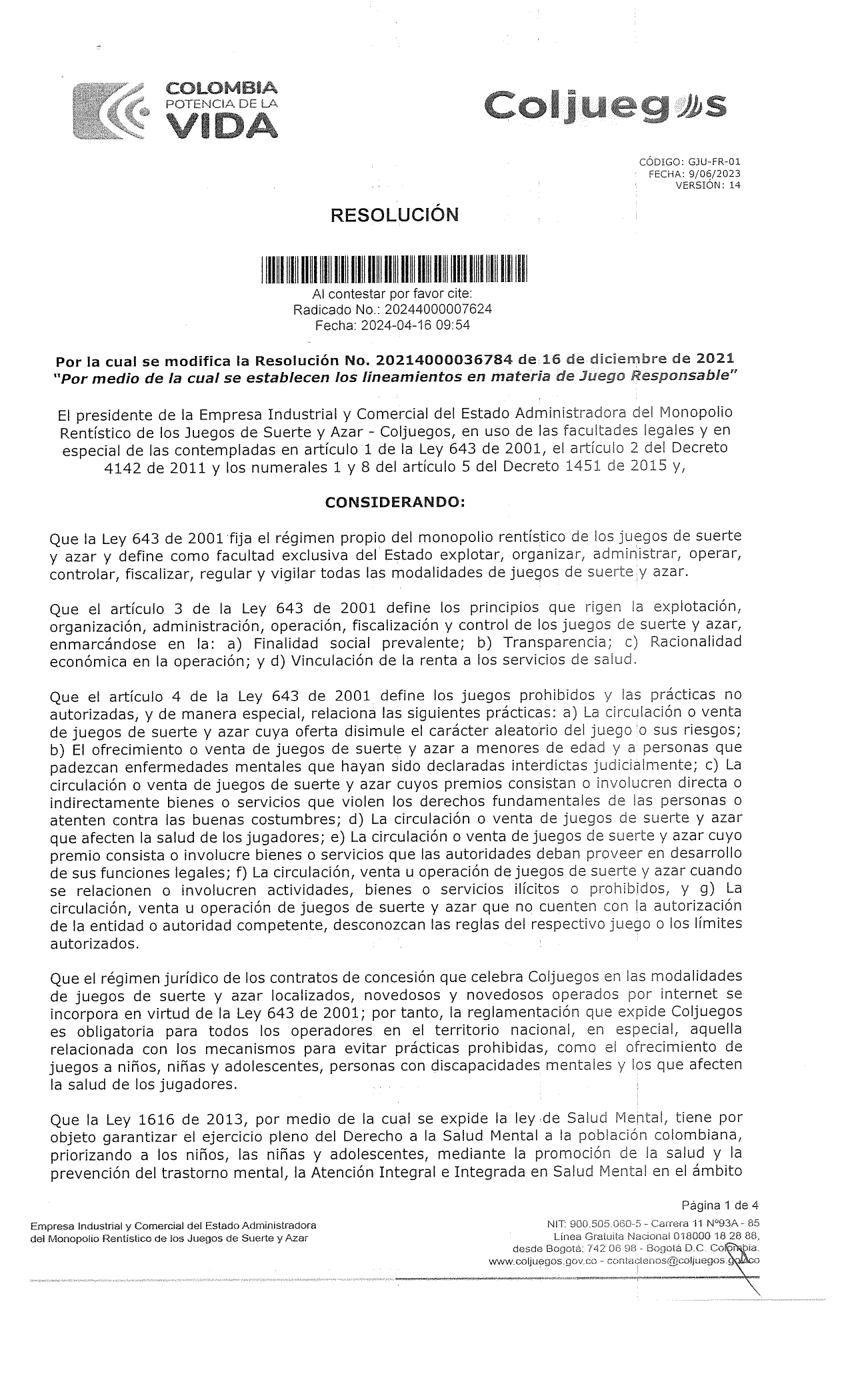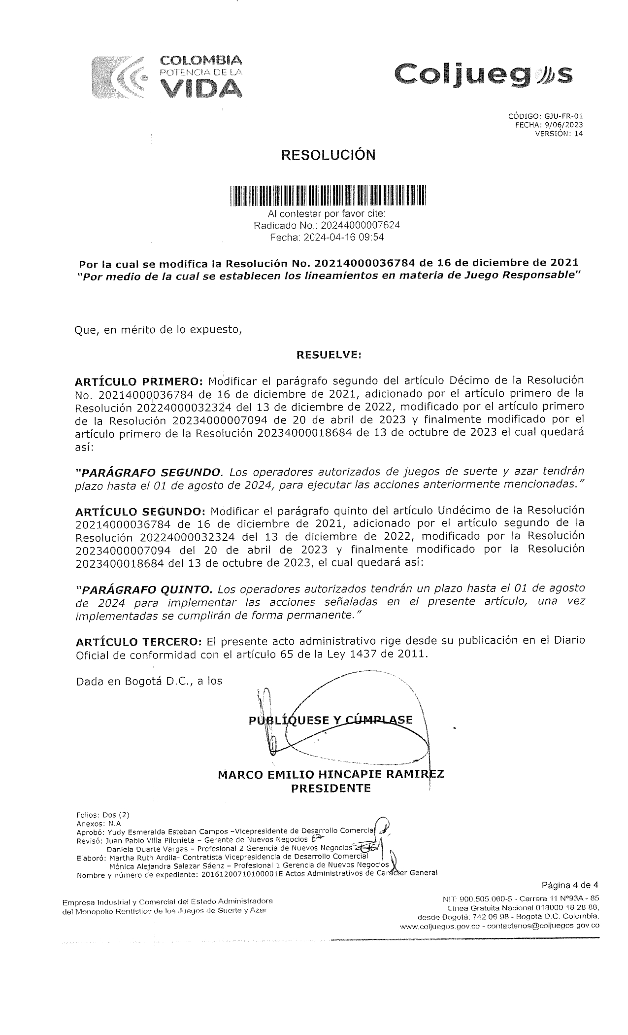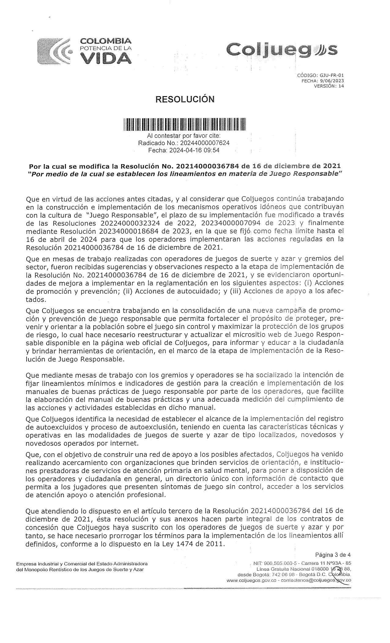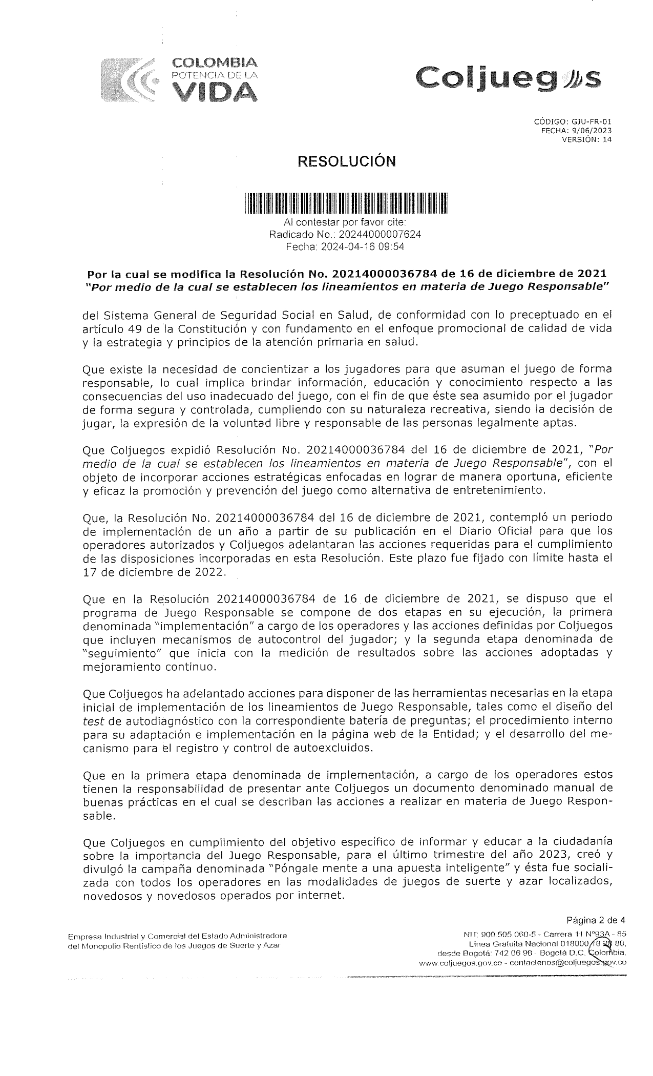 Coljuegos había modificado la resolución 20214000036784 de 16 de diciembre de 2021 que ampliaba el plazo de entrada en vigor de la política de juego responsable hasta el 16 de abril del 2024.