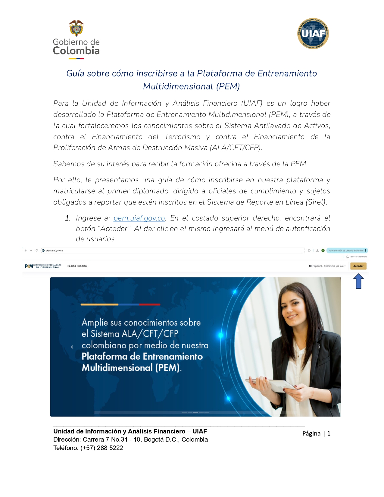 Para la Unidad de Información y Análisis Financiero (UIAF) es un logro haber desarrollado la Plataforma de Entrenamiento Multidimensional (PEM), a través de la cual fortaleceremos los conocimientos sobre el Sistema Antilavado de Activos, contra el Financiamiento del Terrorismo y contra el Financiamiento de la Proliferación de Armas de Destrucción Masiva (ALA/CFT/CFP).