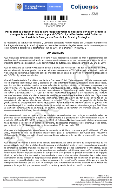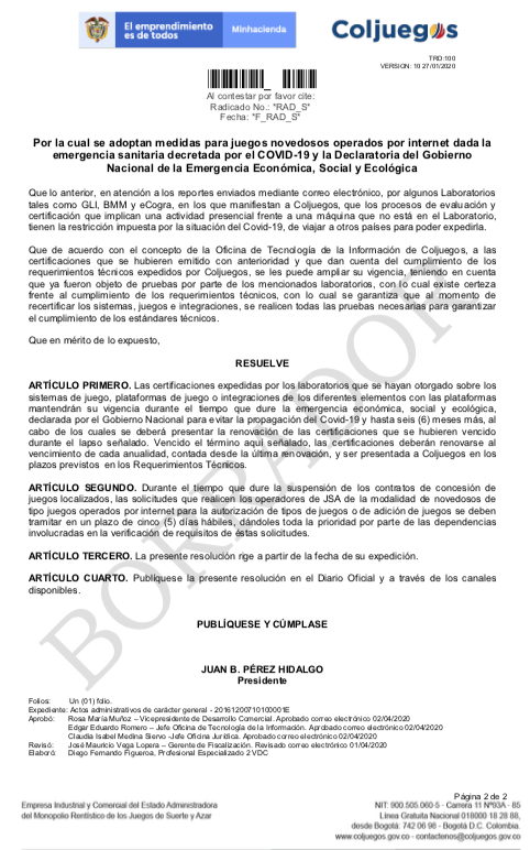 Finalmente, la entidad establecería mediante el acto administrativa que, durante la suspensión de los contratos de concesión de juegos localizados, los operadores de juego online deberán tramitar las solicitudes para la autorización de tipos de juegos o de adición de juegos en un plazo de cinco días hábiles.