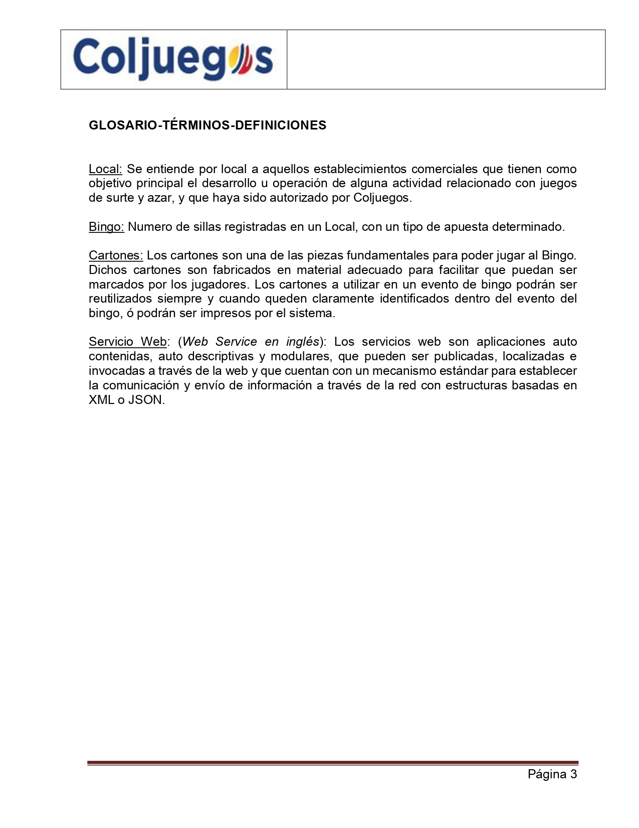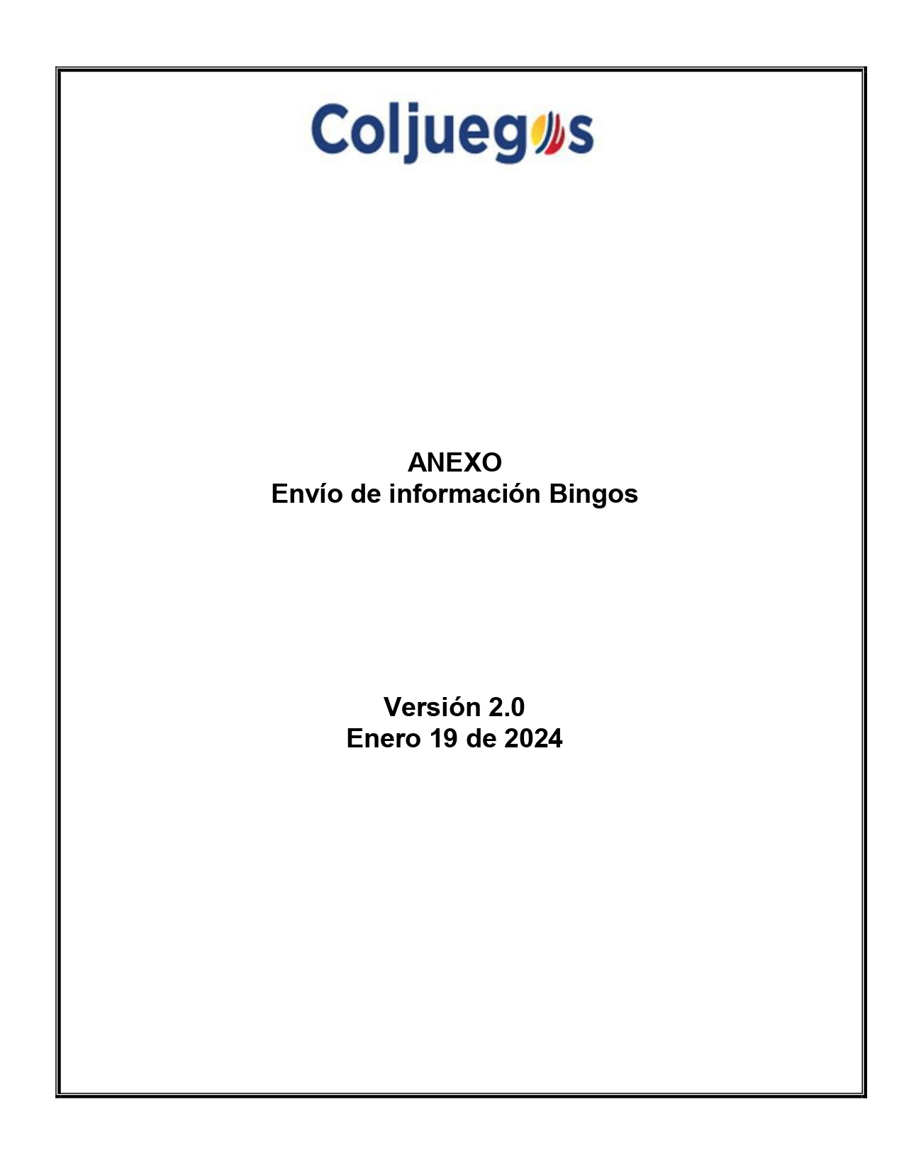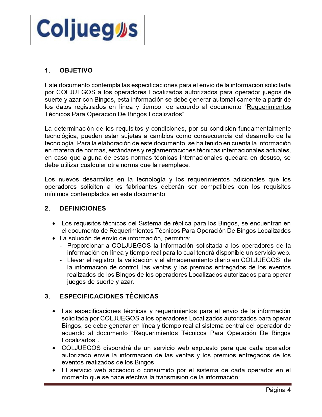 Este documento contempla las especificaciones para el envío de la información solicitada por COLJUEGOS a los operadores Localizados autorizados para operador juegos de suerte y azar con Bingos, esta información se debe generar automáticamente a partir de los datos registrados en línea y tiempo, de acuerdo al documento “Requerimientos Técnicos Para Operación De Bingos Localizados”.