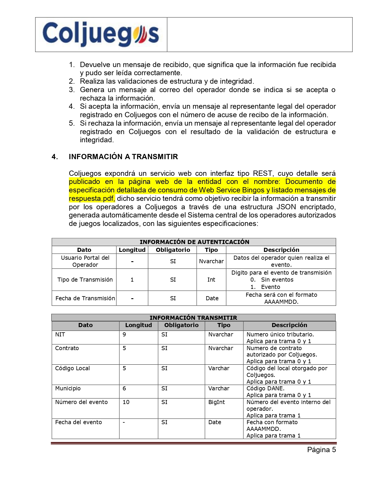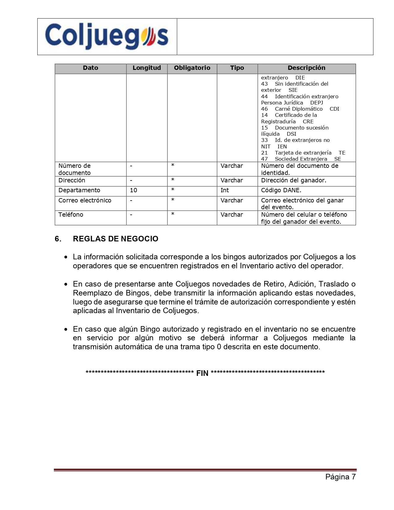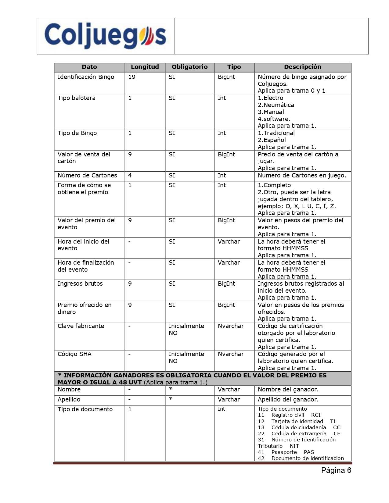 Este documento contempla las especificaciones para el envío de la información solicitada por COLJUEGOS a los operadores Localizados autorizados para operador juegos de suerte y azar con Bingos, esta información se debe generar automáticamente a partir de los datos registrados en línea y tiempo, de acuerdo al documento “Requerimientos Técnicos Para Operación De Bingos Localizados”.