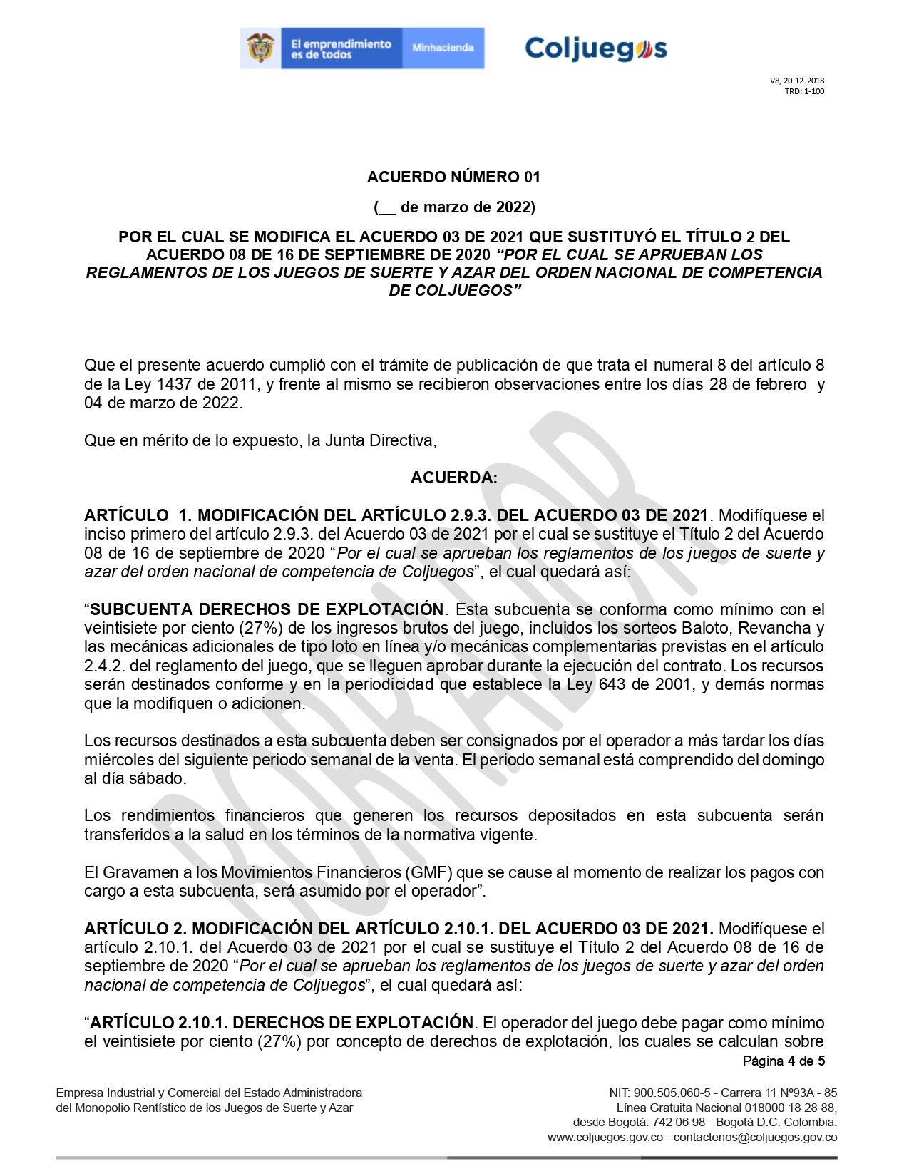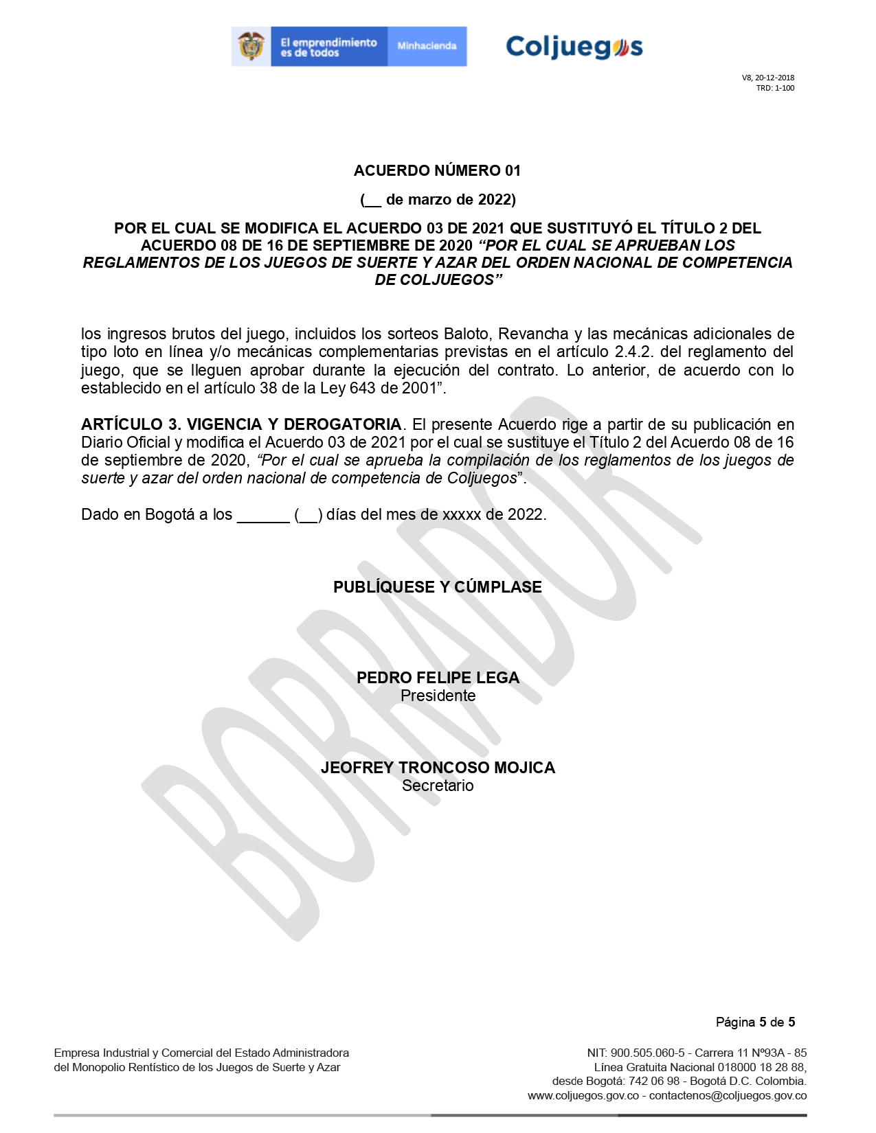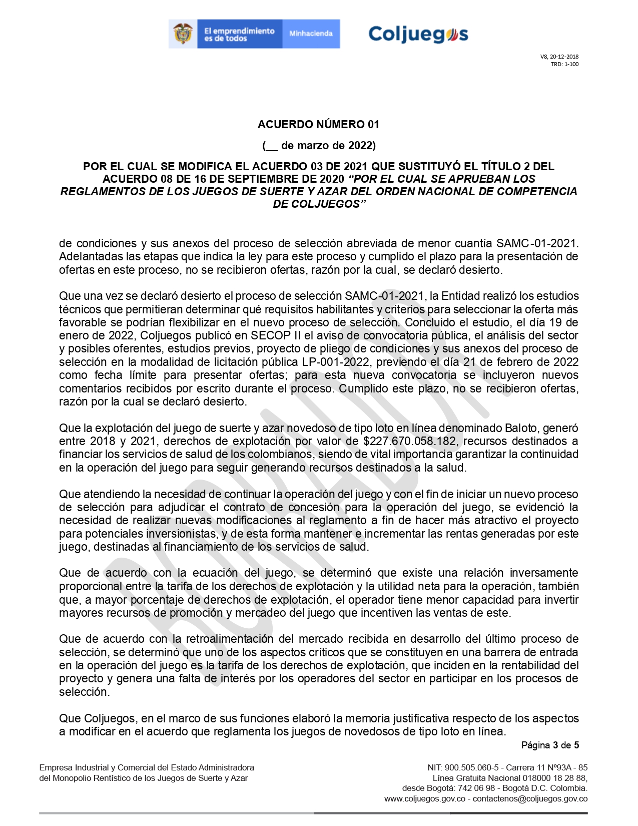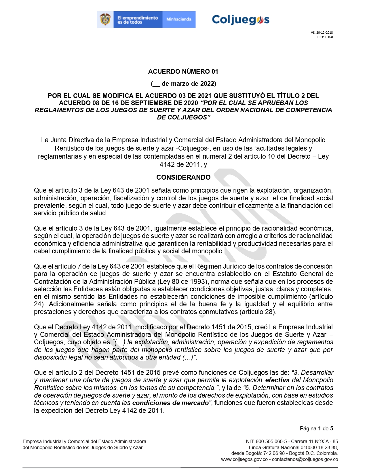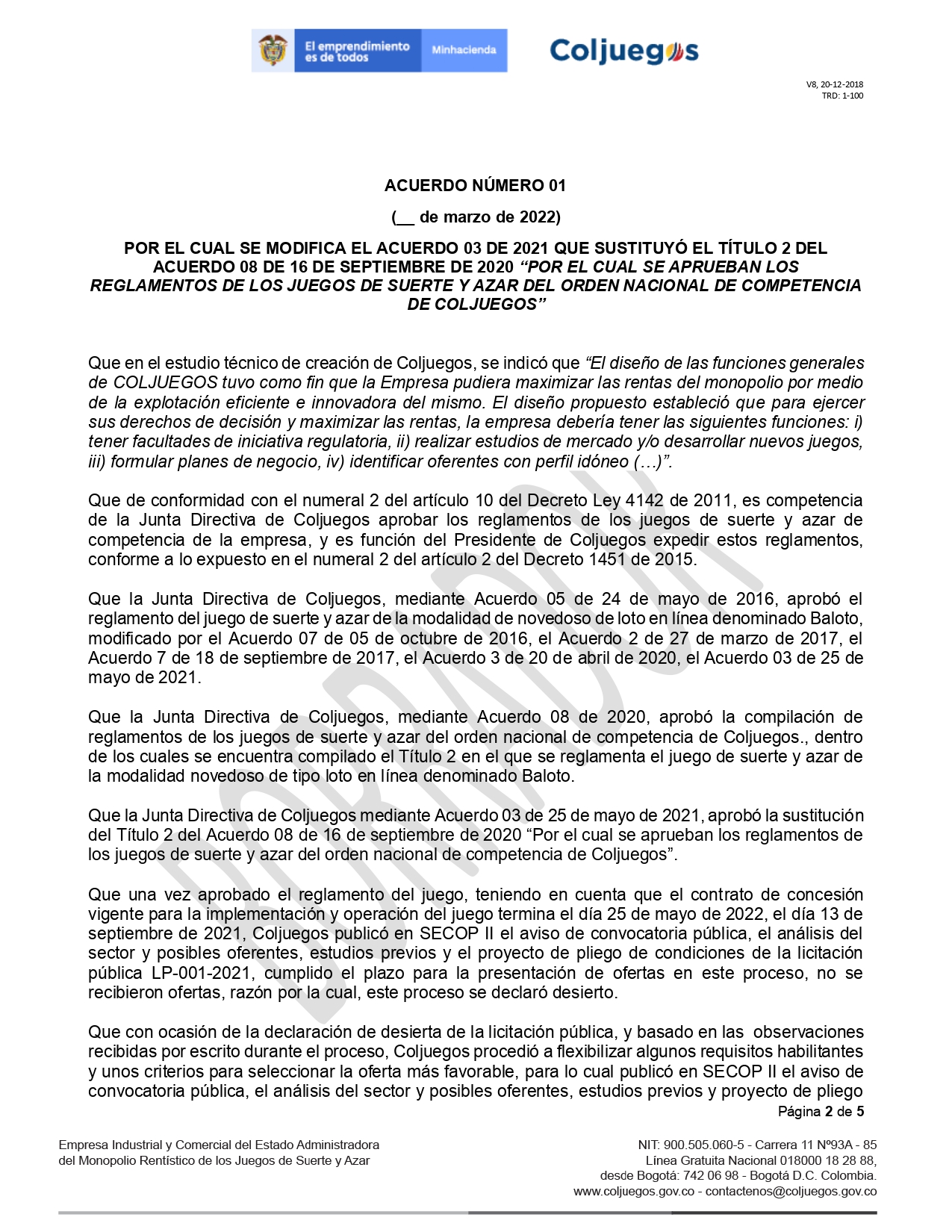 Coljuegos publico el proyecto de acuerdo por el cual se modifica el Acuerdo 03 de 2021 que sustituyó el título 2 del Acuerdo 08 de 16 de septiembre de 2020 por el cual se aprueban los reglamentos de los juegos de suerte y azar del orden nacional de competencia de Coljuegos.