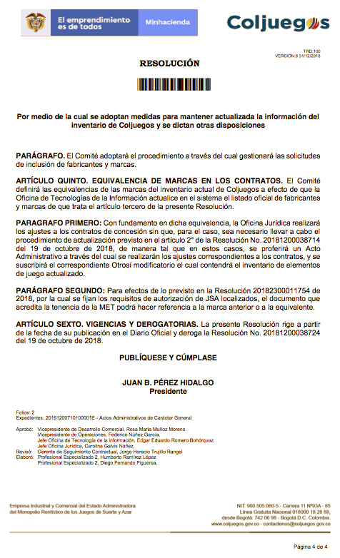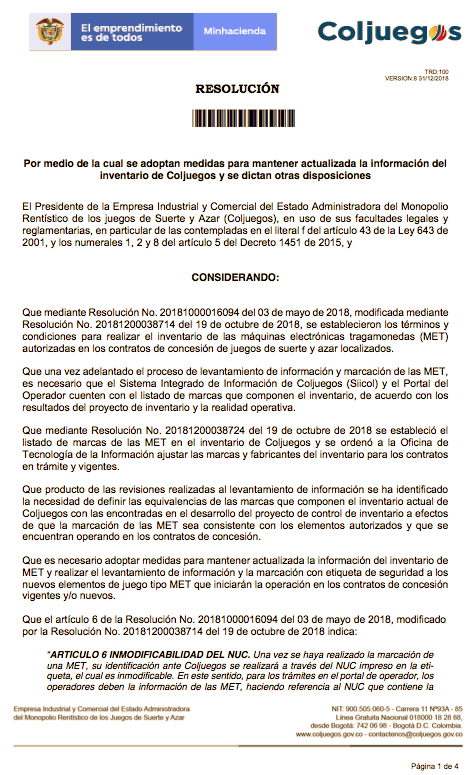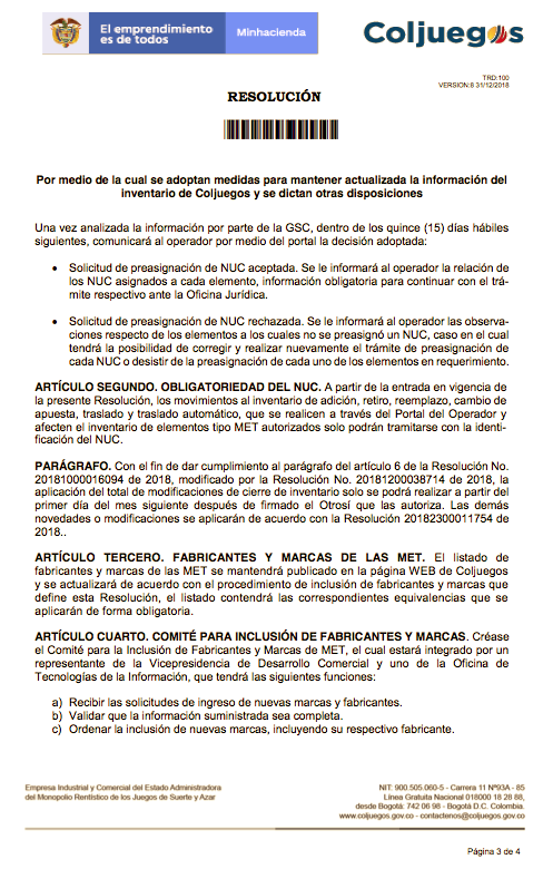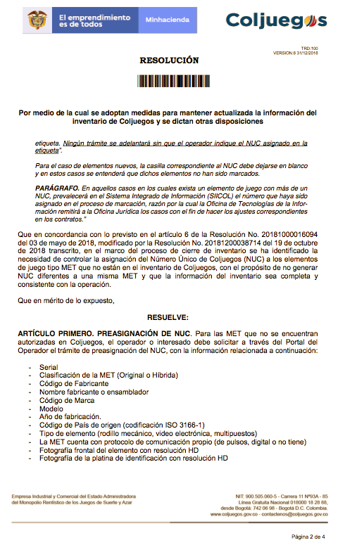 Inventario Coljuegos publicó la resolución No. 20181200038714 se establecieron los términos y condiciones para realizar el inventario de las máquinas electrónicas tragamonedas (MET) autorizadas en los contratos de concesión de juegos de suerte y azar localizados, en la cual se estipula que, para las MET que no se encuentran autorizadas en Coljuegos, el operador o interesado debe solicitar a través del Portal del Operador el trámite de preasignación del NUC, con información básica de la maquina tal como el serial, la clasificación (Original o Hibrida), nombre de fabricante, modelo y algunas fotos del elemento en mención.