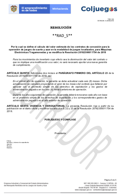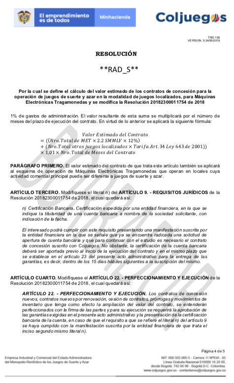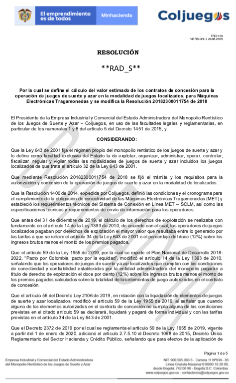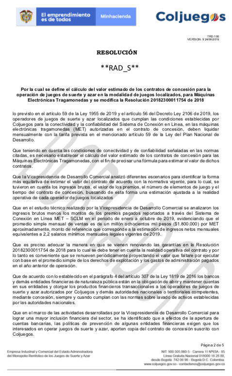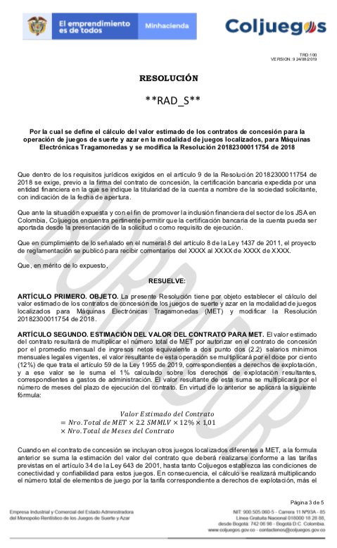 Coljuegos publicó el proyecto de resolución que define el cálculo del valor estimado de los contratos de concesión para la operación de juegos de suerte y azar, específicamente de los casinos o modalidad de localizados, para que los(las) actores interesados envíen sus comentarios hasta el 17 de julio. Este proyecto, modifica la Resolución 20182300011754 de 2018.