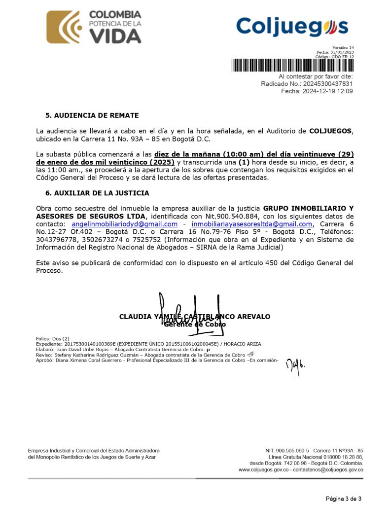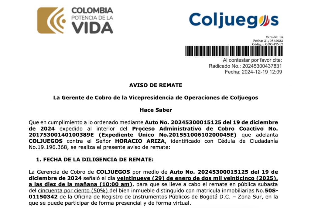 El remate se enmarca en el proceso administrativo de cobro coactivo número 20175300140100389E, iniciado contra Horacio Ariza, identificado con cédula 19.196.368, por deudas pendientes con la entidad. Este evento refuerza el compromiso de Coljuegos en la gestión eficiente de recursos y la implementación de medidas legales para garantizar el cumplimiento de las obligaciones por parte de los deudores.