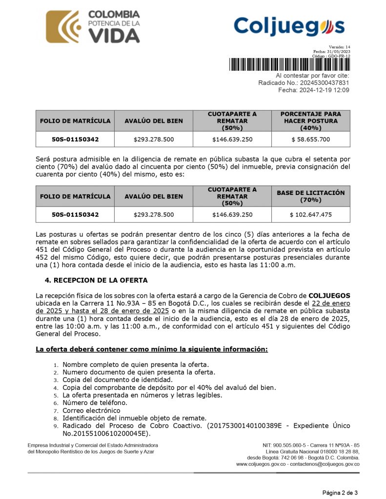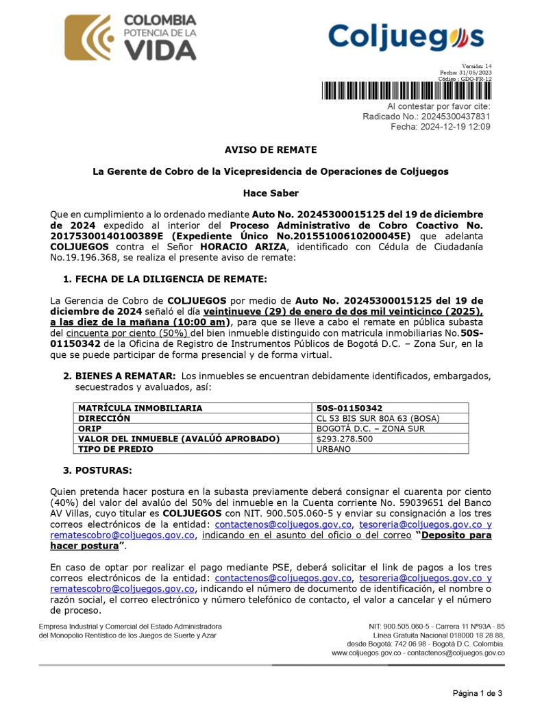 Coljuegos, entidad encargada de regular los juegos de suerte y azar en Colombia, llevará a cabo el remate de un bien inmueble ubicado en la localidad de Bosa, Bogotá D.C., como parte de un proceso de cobro coactivo. El remate se realizará el próximo lunes 29 de enero de 2025 a las 10:00 a.m. en el auditorio de la entidad, con opción de participación presencial y virtual.