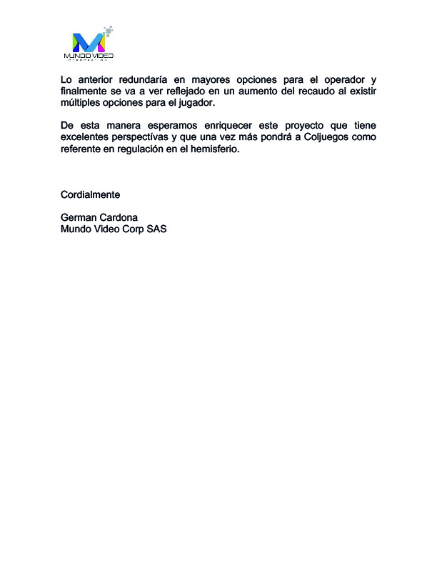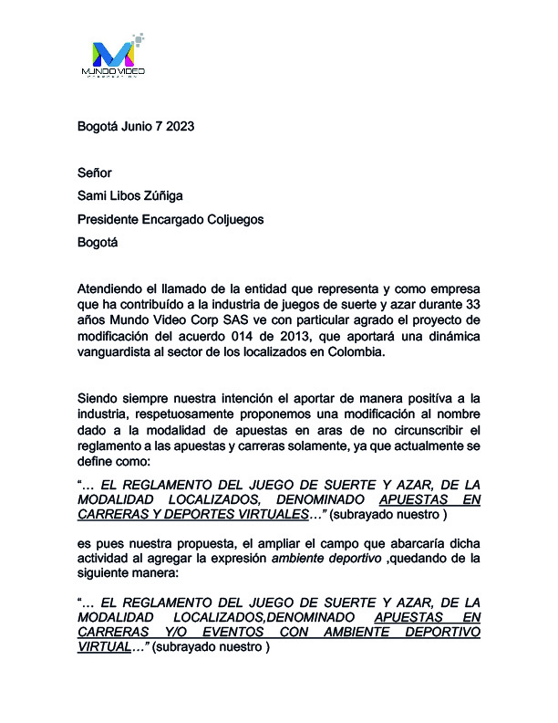 El día 7 de junio de 2023,bajo el radicado No. 20231030192622 Mundo Video Corp. envió sus comentarios a Coljuegos al Proyecto de ACUERDO “POR EL CUAL SE MODIFICAN EL ACUERDO 014 DE 2013 “POR EL CUAL SE APRUEBA EL REGLAMENTO DEL JUEGO DE SUERTE Y AZAR, DE LA MODALIDAD LOCALIZADOS, DENOMINADO APUESTAS EN CARRERAS Y DEPORTES VIRTUALES” Y EL ACUERDO 006 DE 2014 MODIFICATORIO DEL ACUERDO 014 DE 2013”