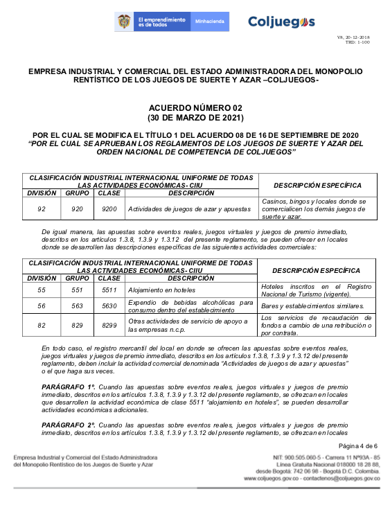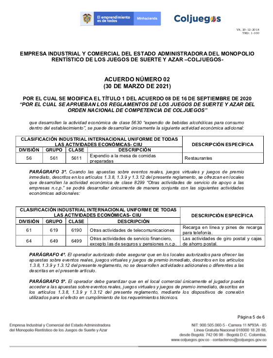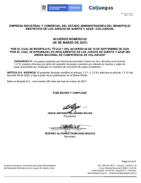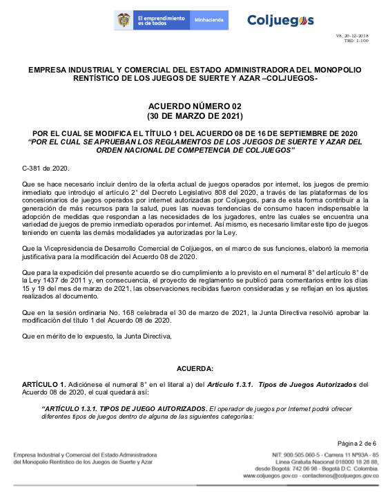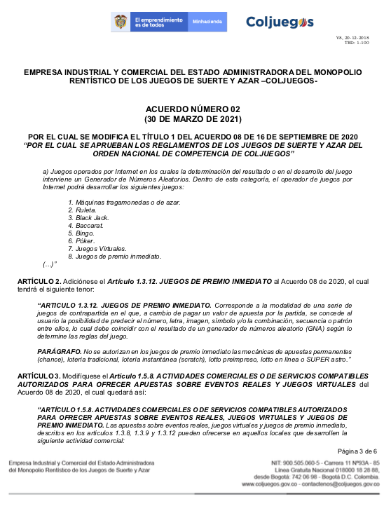 Coljuegos publico el Acuerdo 02 del 30 de marzo del 2021, por el cual permite ofrecer diferentes tipos de juegos por internet en los cuales la determinación del resultado o en el desarrollo del juego interviene un Generador de Números Aleatorios, incluyendo los juegos de premio inmediato.