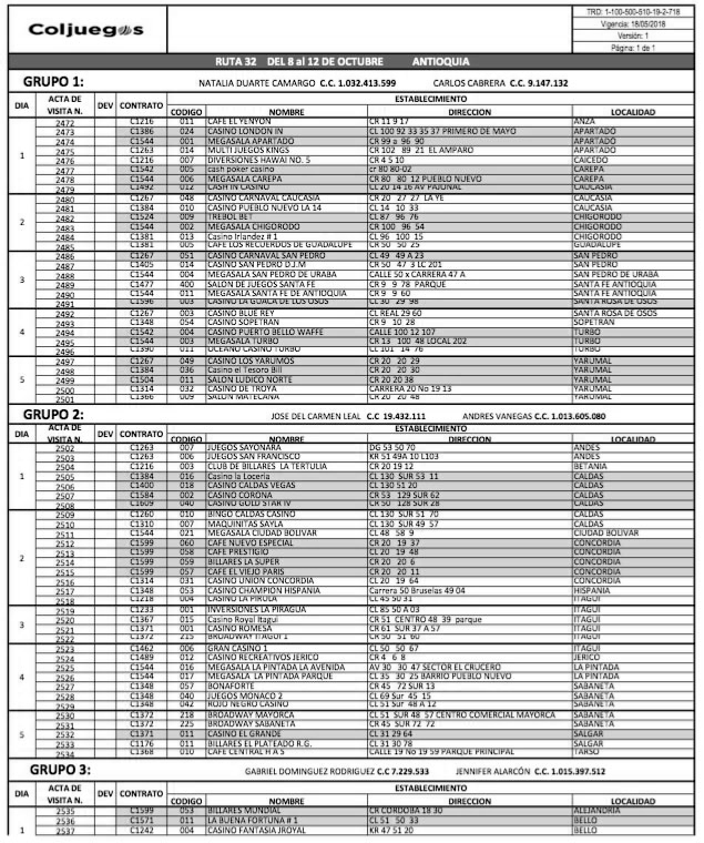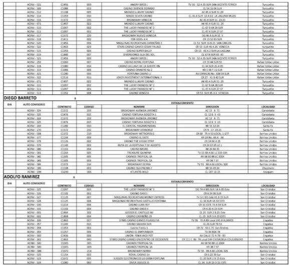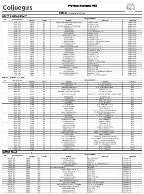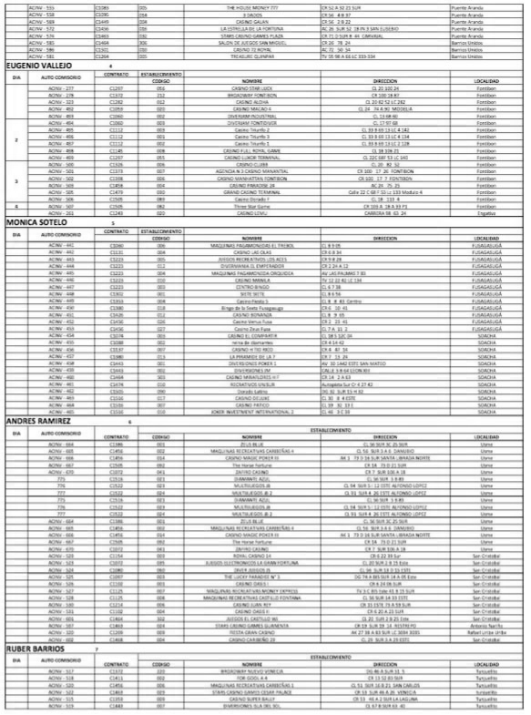 A continuación, dejamos a su disposición los documentos para que revise cuales casinos irán a inspeccionar por su zona y quien será el encargado.