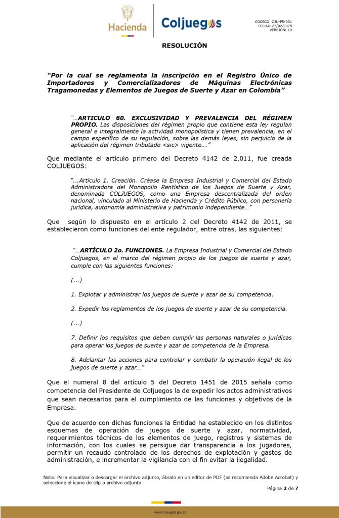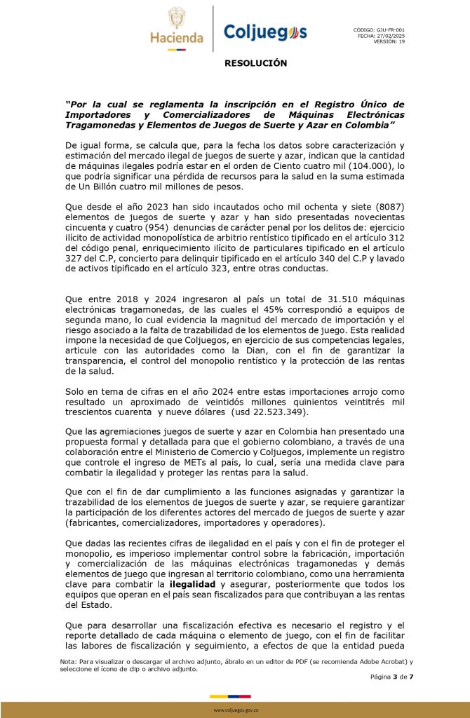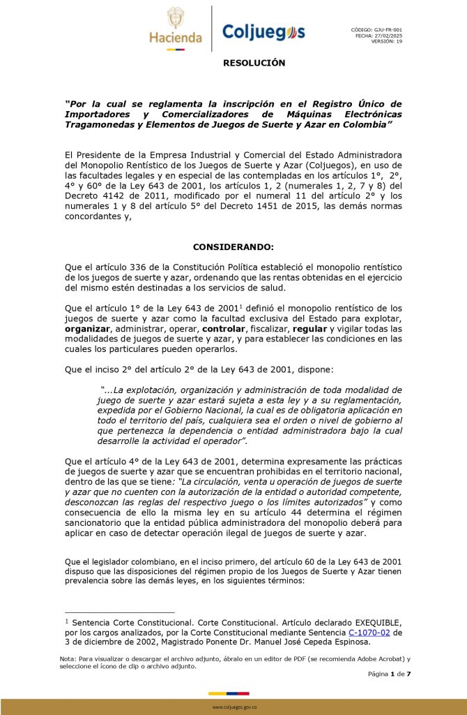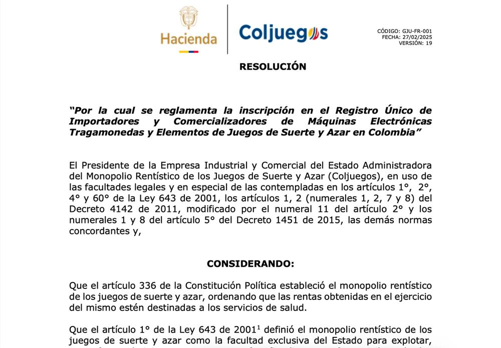 Coljuegos tiene en discusión un proyecto de resolución que puede redefinir la forma como entran al país las máquinas electrónicas tragamonedas (METs). El texto propone crear un Registro Único de Importadores y Comercializadores (RIC) y someter la importación de estos equipos a una autorización previa del regulador, con reportes detallados que conectan la información aduanera con el sistema propio del monopolio de juegos de suerte y azar. El propósito declarado es doble: fortalecer la trazabilidad y atacar el contrabando que hoy compite de forma desleal con la oferta legal.