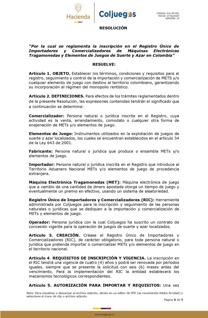 El corazón del proyecto es el RIC. Toda persona natural o jurídica que pretenda importar o comercializar METs deberá inscribirse en este registro, cuya vigencia será de cuatro años, renovable. La simple existencia del RIC no agota la obligación: cada importador deberá solicitar autorización previa a Coljuegos para traer máquinas al país y, dentro de los cinco días hábiles siguientes a la nacionalización, reportar equipo por equipo. El reporte incluye número de serie, marca, modelo, fabricante, año de fabricación, país de origen, fotografías de alta resolución (vista frontal y placa de identificación), cantidad importada y destino previsto indicando razón social y NIT del comprador.