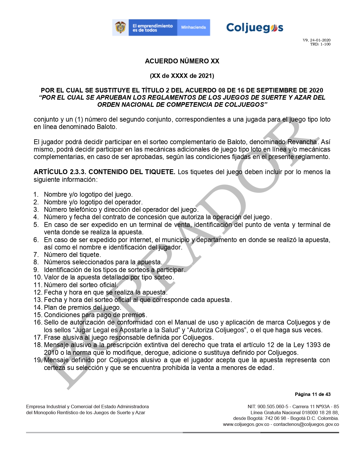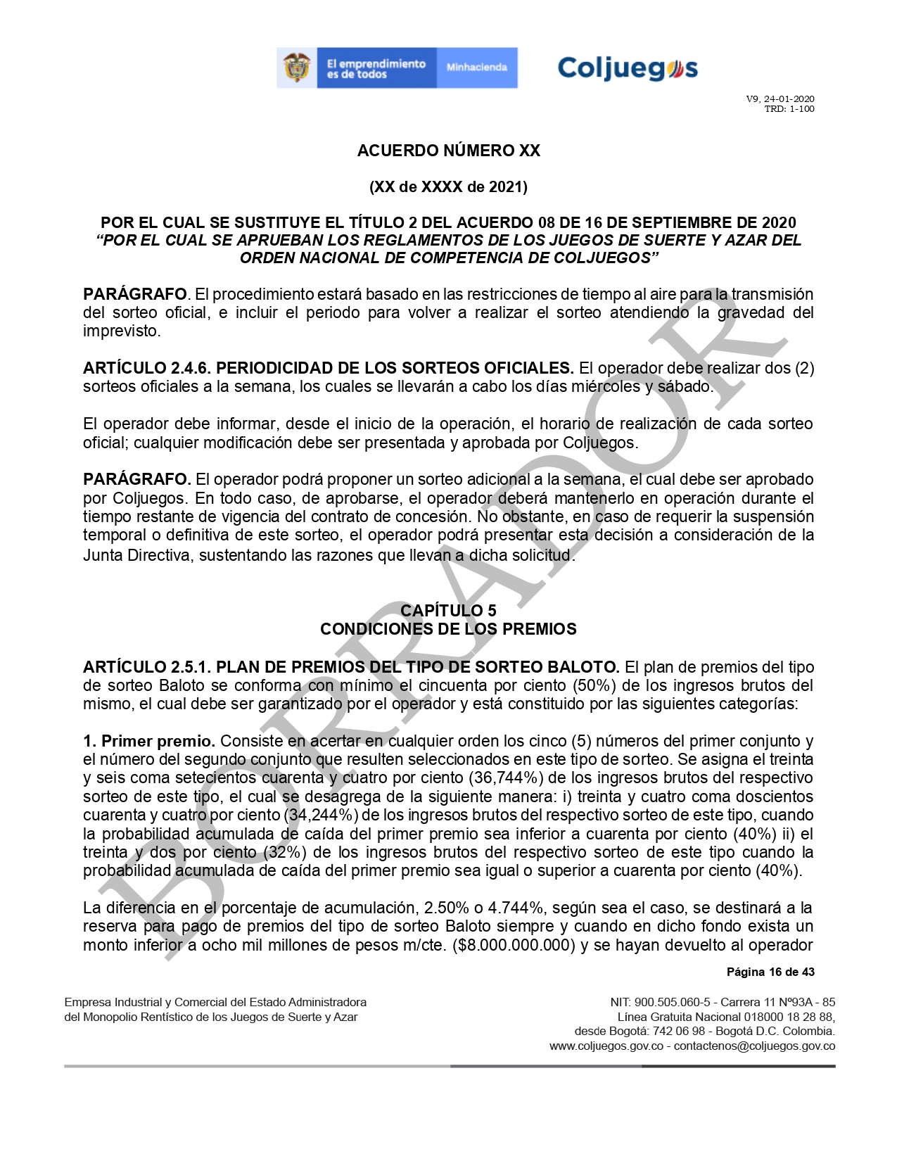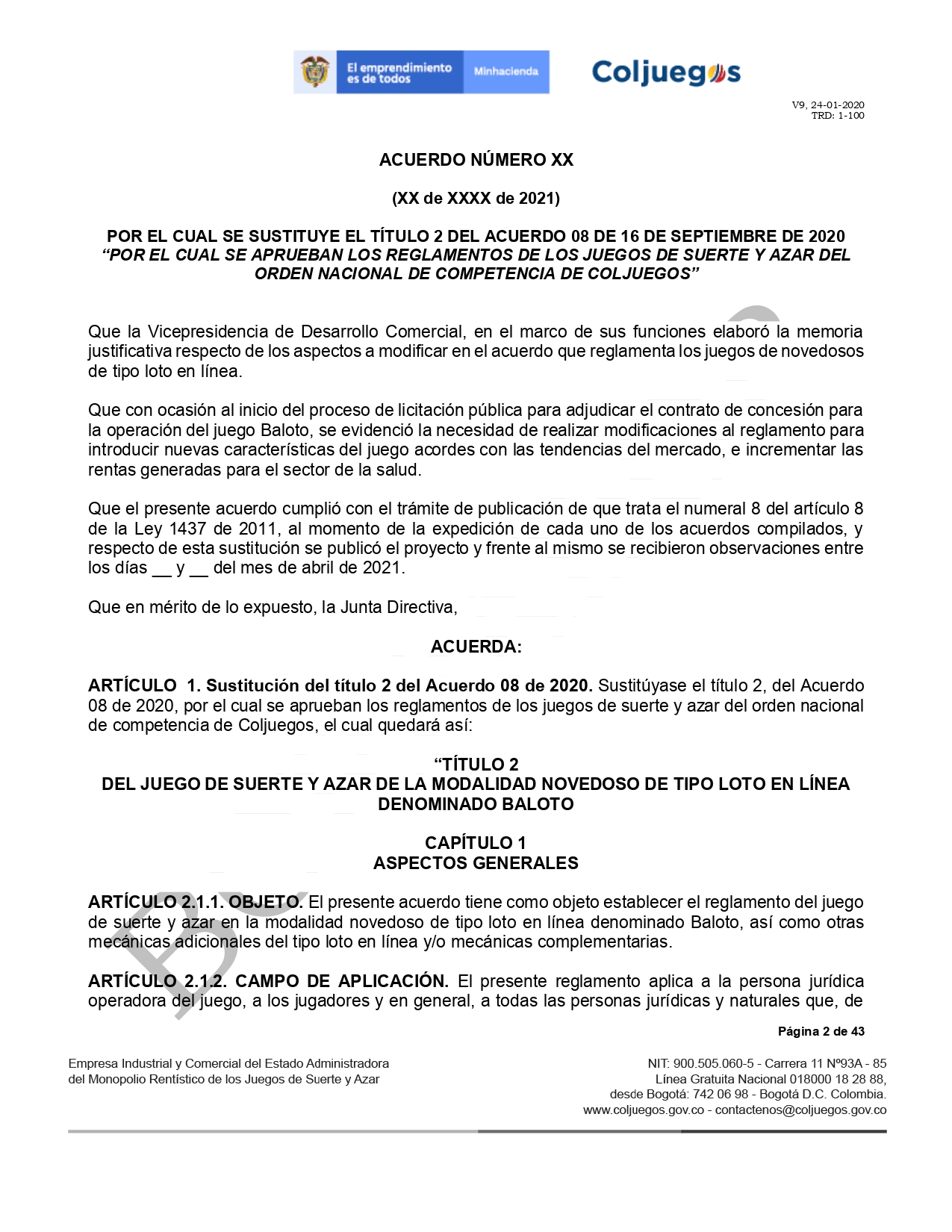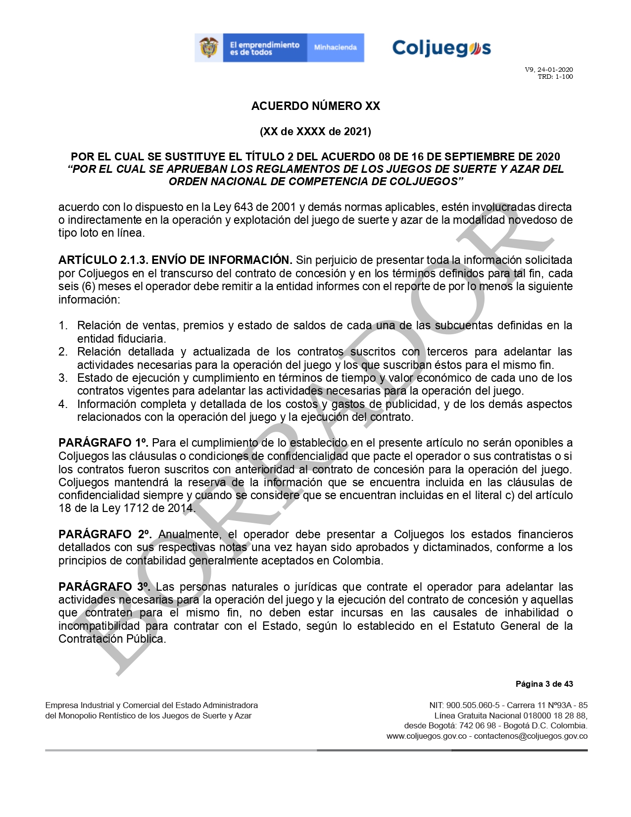 De esta forma entonces, la entidad busca establecer el reglamento del juego de suerte y azar en la modalidad novedoso de tipo loto en línea denominado Baloto, así como otras mecánicas adicionales del tipo loto en línea y/o mecánicas complementarias. Comenzando por el envío de información, el operador cada 6 meses debe enviar un reporte con la siguiente información: