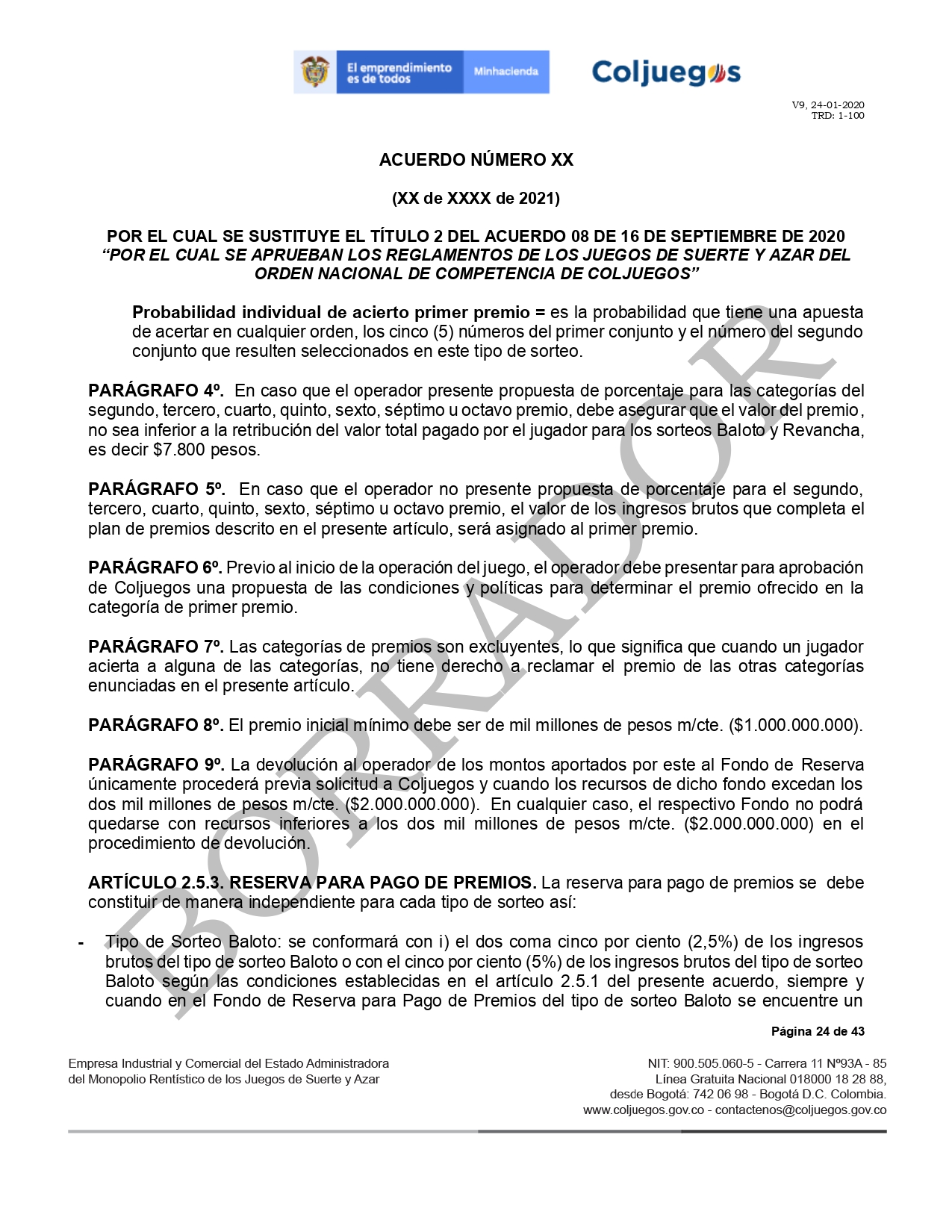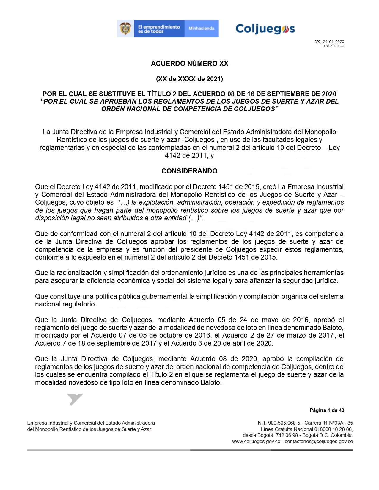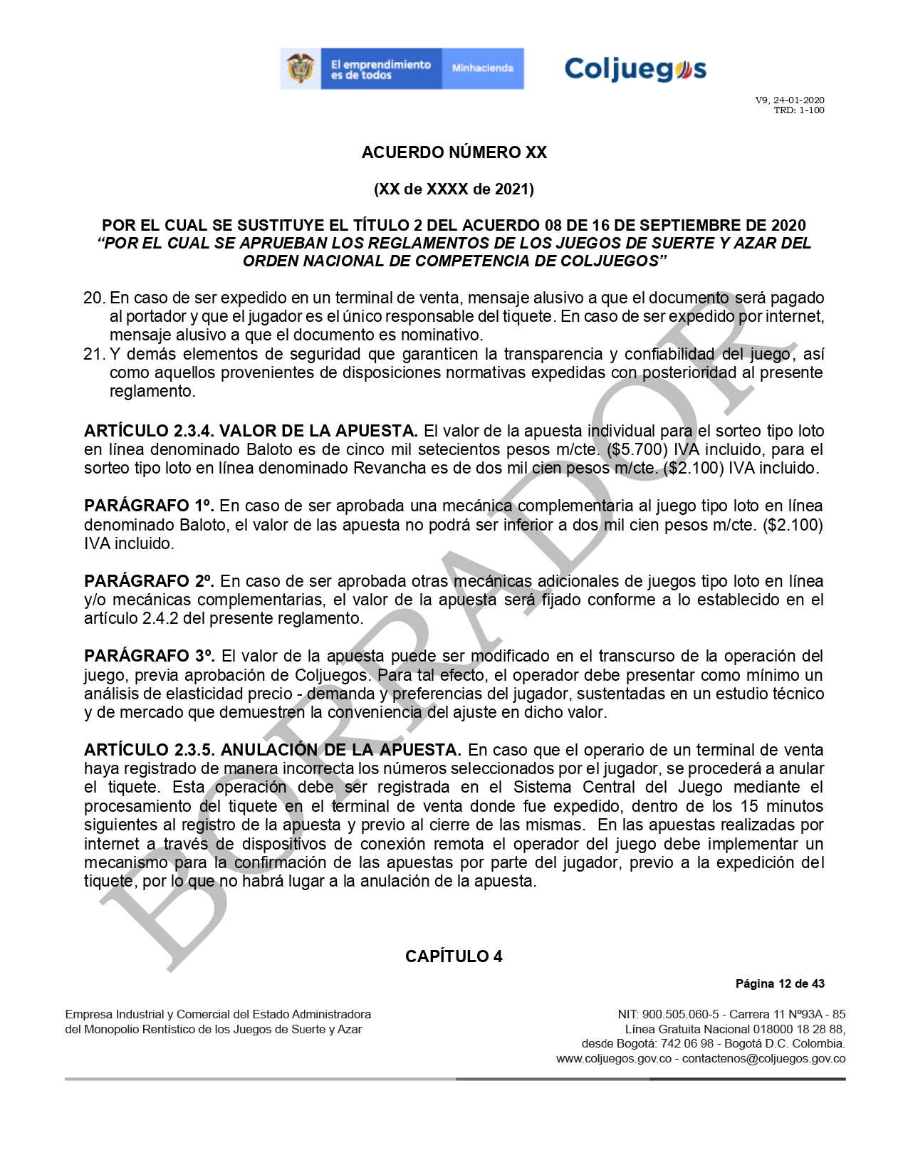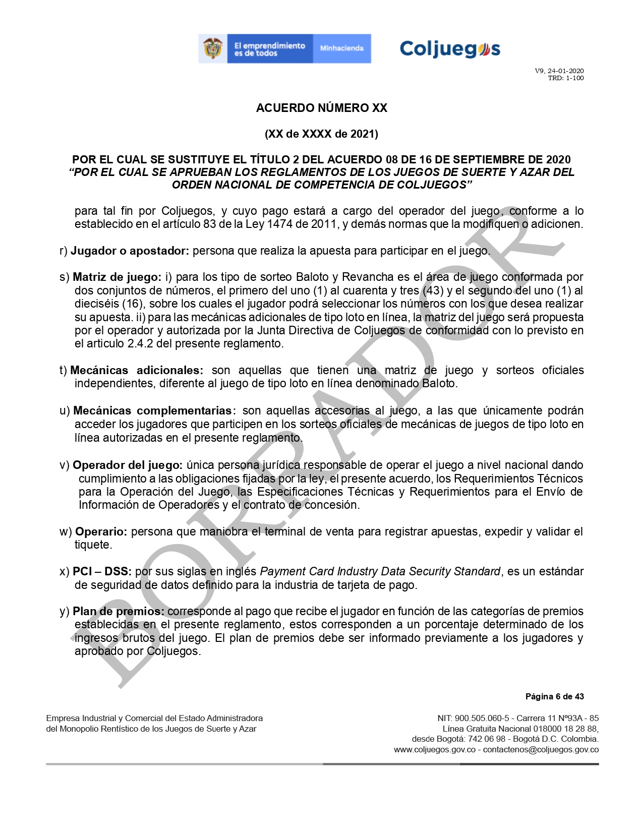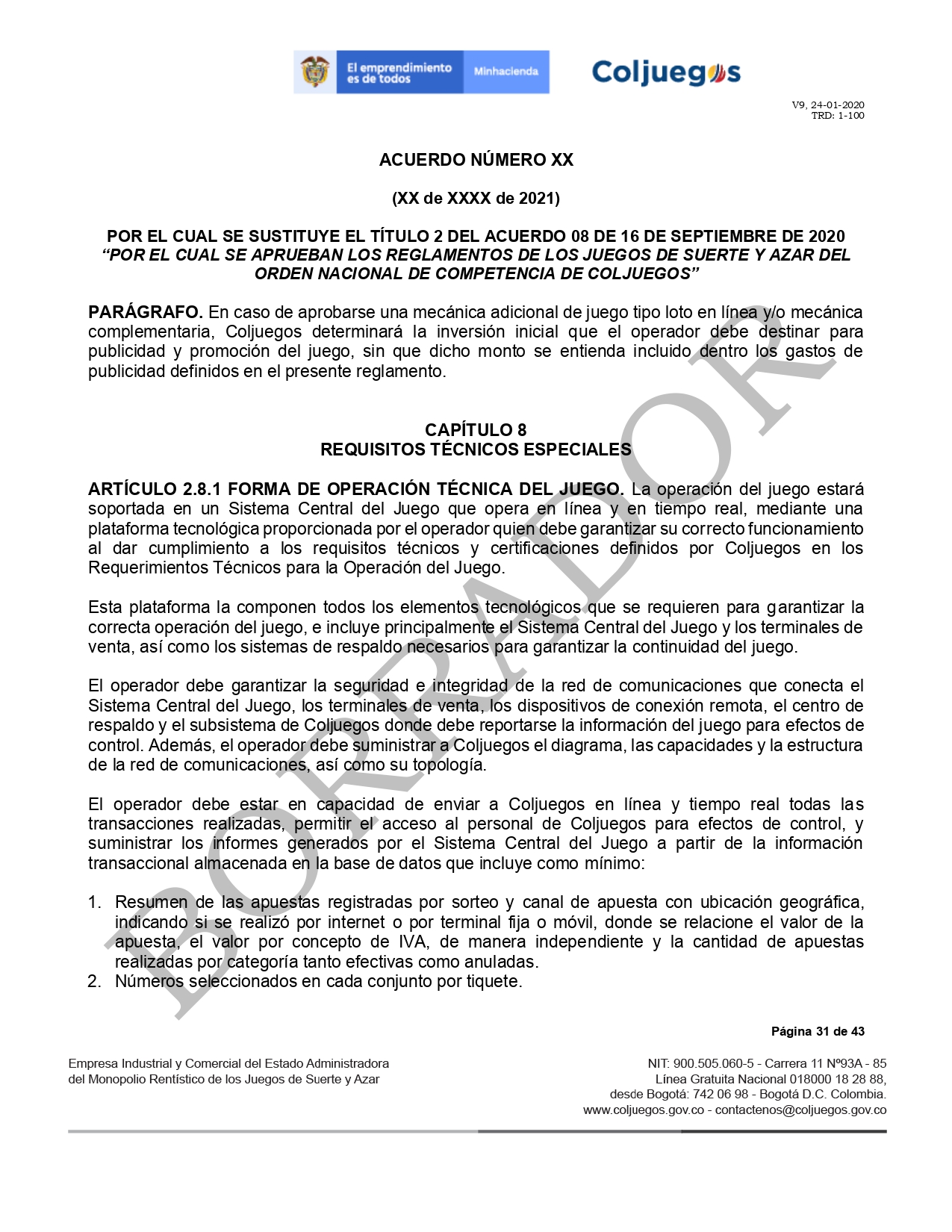 De esta forma entonces, la entidad busca establecer el reglamento del juego de suerte y azar en la modalidad novedoso de tipo loto en línea denominado Baloto, así como otras mecánicas adicionales del tipo loto en línea y/o mecánicas complementarias. Comenzando por el envío de información, el operador cada 6 meses debe enviar un reporte con la siguiente información: