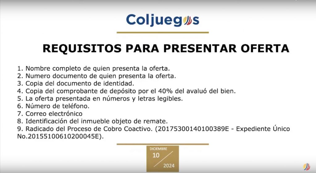 La convocatoria al remate fue publicada en medios de circulación nacional y local, además de la página web y redes sociales de Coljuegos, cumpliendo con los requisitos legales.