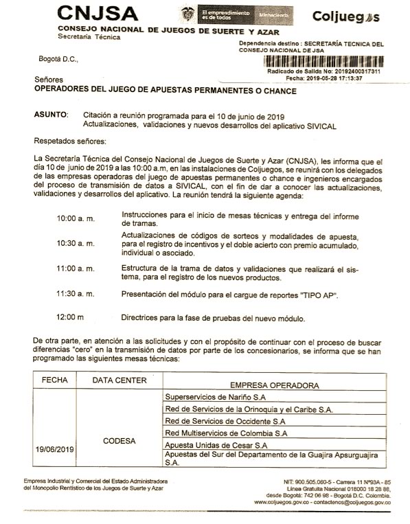 Hoy a las 10 de la mañana se celebrará una reunión en las instalaciones de Coljuegos, sobre actualizaciones, validaciones y desarrollo del sistema SIVICAL el cual va dirigido especialmente a las empresas operadoras de apuestas permanentes.