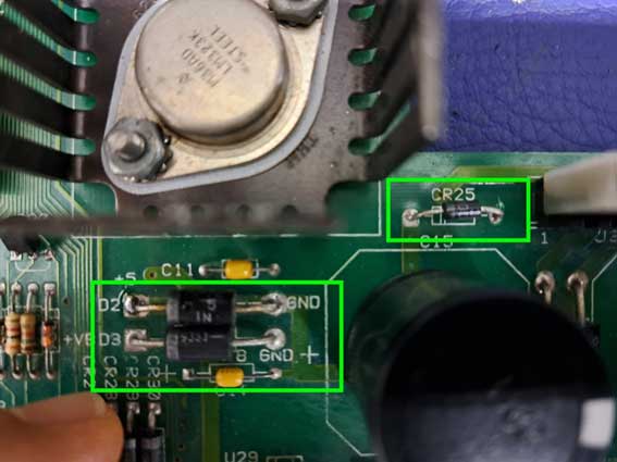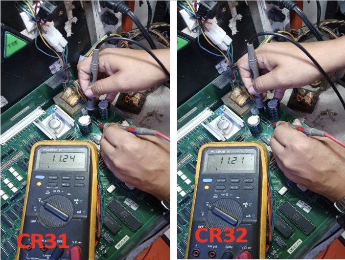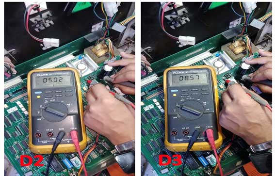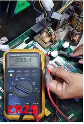 Además, se debe revisar los voltajes de los diodos D2, D3, CR25,