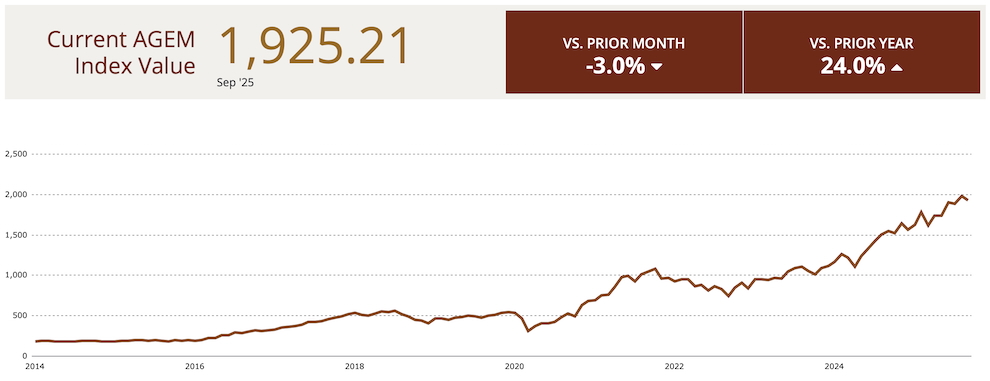 Las Vegas, October 2025 — The Association of Gaming Equipment Manufacturers (AGEM) Index, which tracks the stock performance of major global gaming technology suppliers, posted a 3.0% month-over-month decline in September 2025 but remains up 24% year-on-year, reflecting the sector’s overall resilience amid fluctuating market conditions.