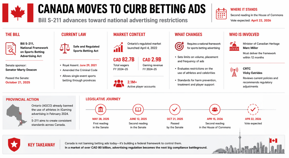 Canada is moving closer to federal control over sports betting advertising with the progress of Bill S-211, the National Framework on Sports Betting Advertising Act, a proposal that passed the Senate on October 21, 2025 and is currently at second reading in the House of Commons as of April 15, 2026, with a vote expected on April 22, 2026. The initiative is sponsored by Senator Marty Deacon and aims to establish a mandatory national framework governing betting advertising exposure.