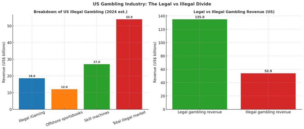 Las Vegas / Washington – August 26, 2025. The U.S. gambling industry is facing a crisis hiding in plain sight. A new report shows the illegal gambling market has exploded to more than US$673.6 billion annually, nearly a third of the nation’s entire gambling economy. Despite record casino revenues, aggressive legalization of sports betting, and expanding online regulation, the underground market is growing faster than the legitimate one—and it’s gutting the industry from the inside out.