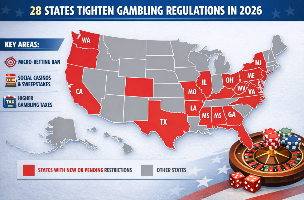 Meanwhile, states including Indiana, Louisiana, Maine, Mississippi, Oklahoma, and Virginia are moving to restrict social casinos and sweepstakes models, closing regulatory gaps where operators used virtual currencies or promotional systems to simulate real-money gambling.