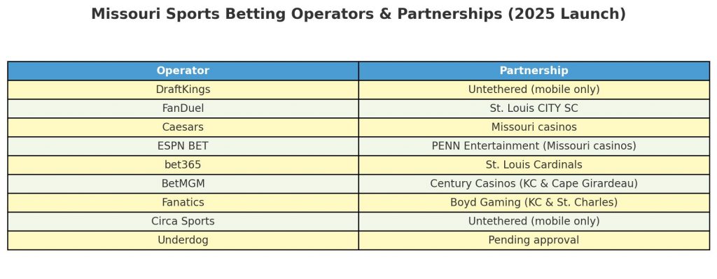 A total of nine sportsbooks are expected to debut on Day 1. Big-name operators include DraftKings, FanDuel, Caesars, ESPN BET, bet365, BetMGM, Fanatics, Circa Sports, and Underdog. Two of those — DraftKings and Circa — snagged “untethered” mobile licenses, meaning they don’t need to be tied to a casino or pro team. The rest secured market access deals with Missouri’s casinos and franchises, such as FanDuel with St. Louis CITY SC and bet365 with the St. Louis Cardinals.