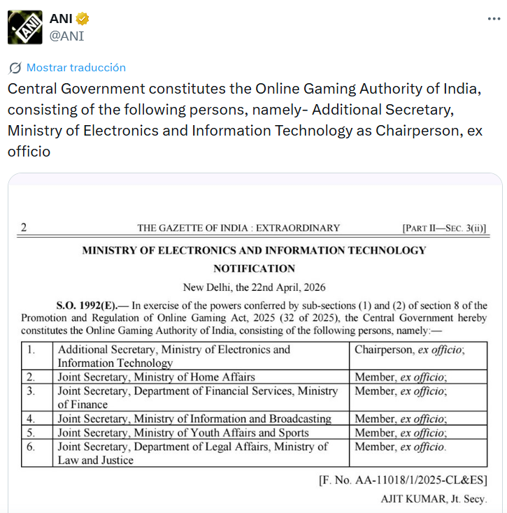 India will activate its new national online gaming framework on May 1, 2026, creating the Online Gaming Authority of India (OGAI) and formally separating permitted growth segments; esports, social gaming and educational games, from the prohibited online money gaming model. The shift operationalizes the Promotion and Regulation of Online Gaming Act, 2025, approved in August 2025 and published as Act No. 32 of 2025, alongside the Promotion and Regulation of Online Gaming Rules, 2026, notified ahead of implementation.