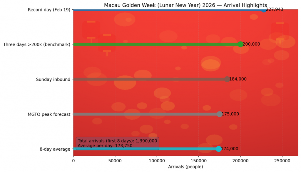 Macau’s Chinese Lunar New Year “Golden Week” traffic accelerated into the final stretch of the holiday period, with total visitor arrivals reaching about 1.39 million across the first eight days. That puts the daily average at roughly 174,000 arrivals, broadly matching official expectations for peak-day volumes during the break.