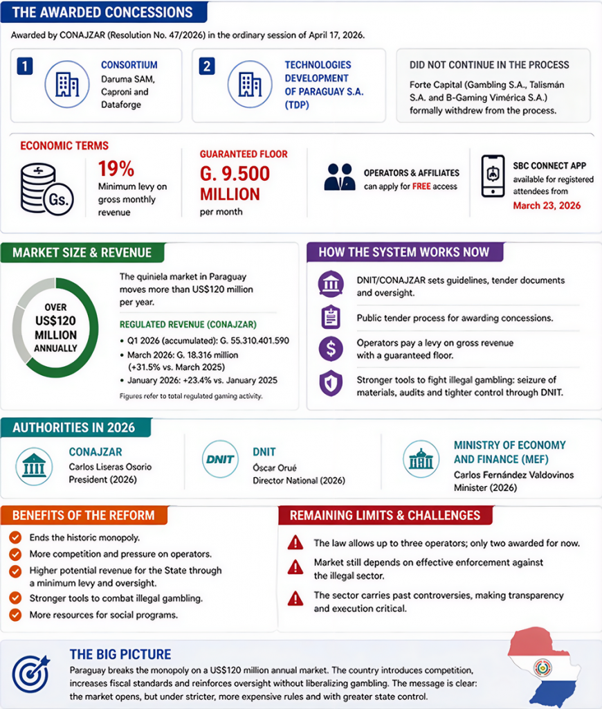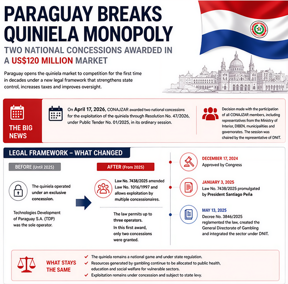 Paraguay executed on April 2026 the opening of the quiniela business after decades of exclusivity, with the award of two national concessions by the National Gambling Commission (CONAJZAR) through Resolution No. 47/2026, under Public Tender No. 01/2025. The decision marks the first practical implementation of Law No. 7438/2025, which eliminated the single-operator model and enabled regulated competition.