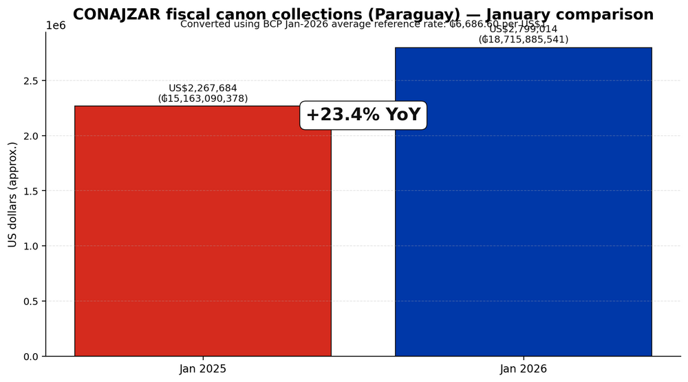 Paraguay’s gambling regulator CONAJZAR opened 2026 with a strong fiscal signal: G. 18,715,885,541 collected in January 2026 from the sector’s fiscal canon, up from G. 15,163,090,378 a year earlier—an increase of roughly 23.4%.