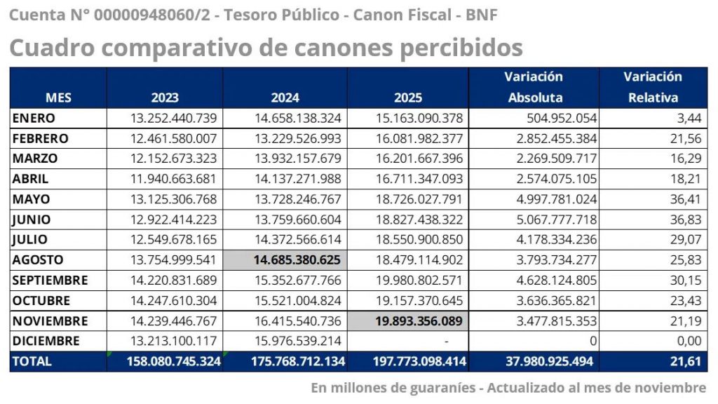 November was particularly strong. Conajzar reported monthly revenues of PYG 19,893,356,089 (around USD 2.89 million), up 21.19% year-on-year, reinforcing the upward trend already visible in previous reports covering January–August, when collections had surpassed USD 19 million.