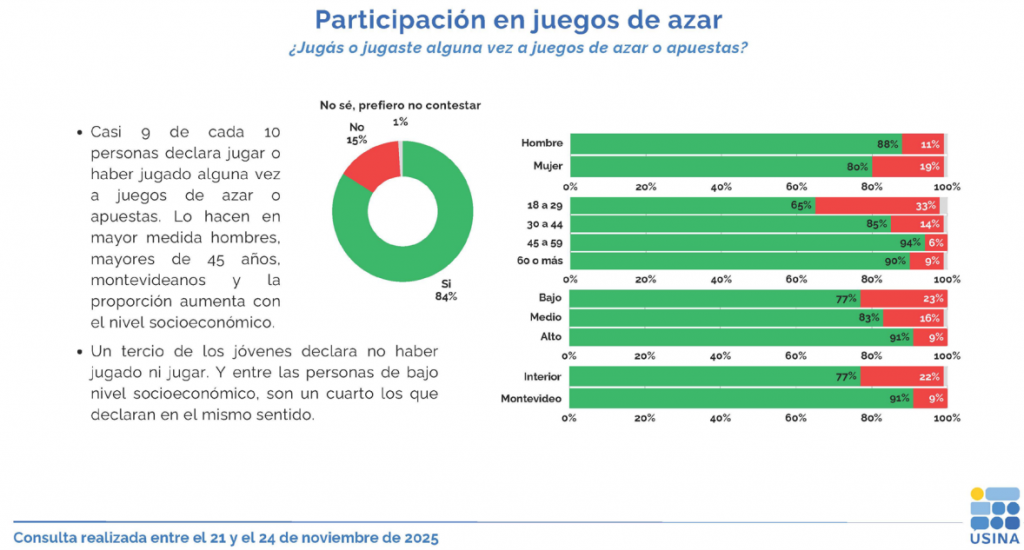 The study, conducted between November 21–24, 2025 on a sample of 500 adults, reports participation rates of 84% among men and 72% among women, with higher concentration among people over 45 and residents of Montevideo. Physical channels dominate with 61% usage, compared to 12% online, while weekly spending is mostly below UYU 500. The survey also highlights social concerns: 87% link gambling to financial problems and 75% associate it with addiction, elevating the issue to a public policy priority.