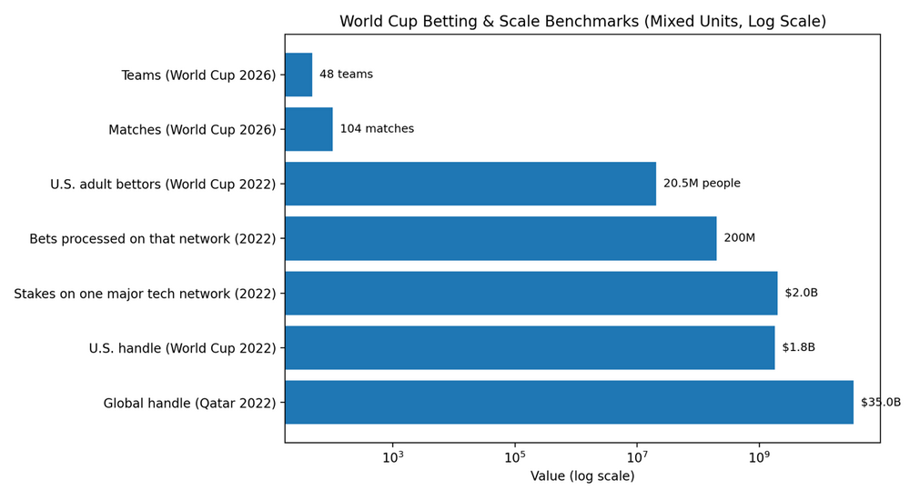 That expansion matters because volume tends to scale with match count and market access. For context, widely cited market estimates put global stakes around $35 billion during Qatar 2022, roughly +65% versus 2018—establishing a high-water mark that many expect 2026 to surpass on sheer scale and reach.