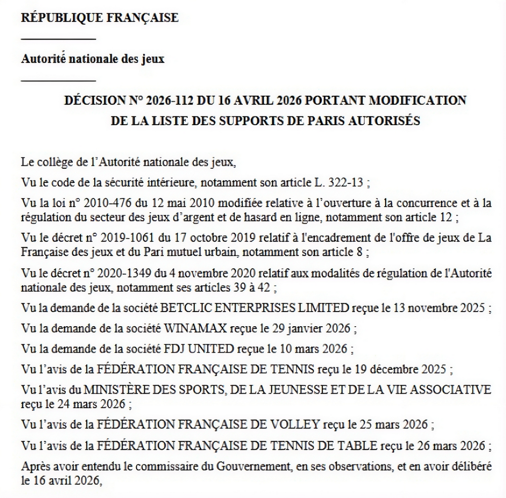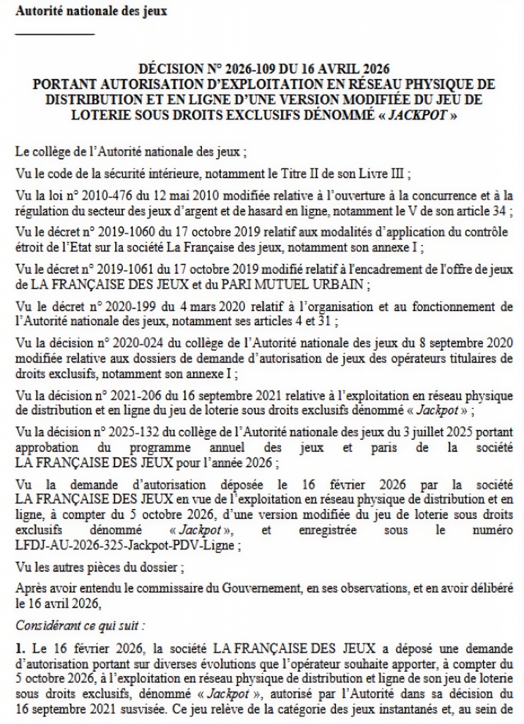 Decision No. 2026-109 allows FDJ to launch from October 5, 2026, a revised version of “Jackpot”, across retail and online channels, reducing the payout from 71% to 70% while keeping the €5 ticket price unchanged. In parallel, Decision No. 2026-112 adds new events to the regulated betting catalogue: the United Cup (tennis), Japanese men’s and women’s volleyball leagues, and the Table Tennis World Cup, following formal requests submitted by Betclic Enterprises Limited, Winamax, and FDJ United between November 2025 and March 2026.