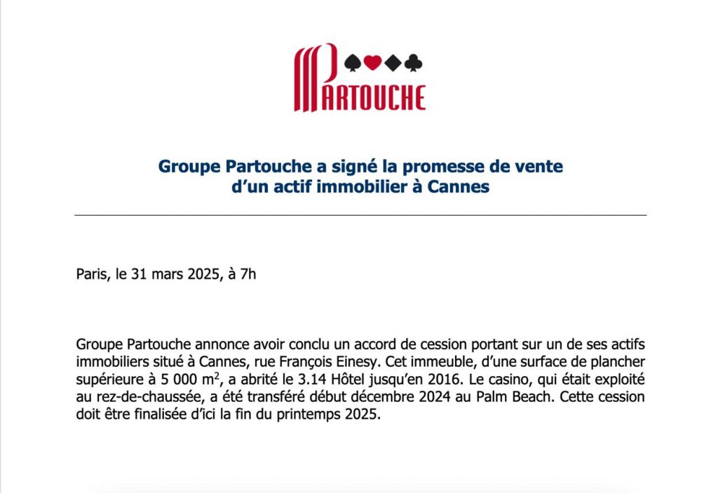 In a bold real estate and strategic move, Groupe Partouche has signed a binding agreement to sell its historic Cannes property on rue François Einesy, which once housed the Hôtel 3.14 and a ground-floor casino. The venue ceased operations in 2024 when the casino relocated to the glamorous Palm Beach site. The transaction is expected to be finalized by spring 2025, aligning with the group’s asset optimization plan.
