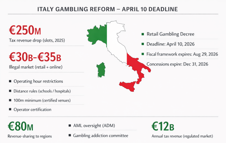 Italy is accelerating its land-based gambling reform in 2026 under mounting fiscal and regulatory pressure. The government, led by Giorgia Meloni and Economy Minister Giancarlo Giorgetti, aims to finalize a decree by April 10, 2026, following a €250 million decline in tax revenues from slot machines in 2025.