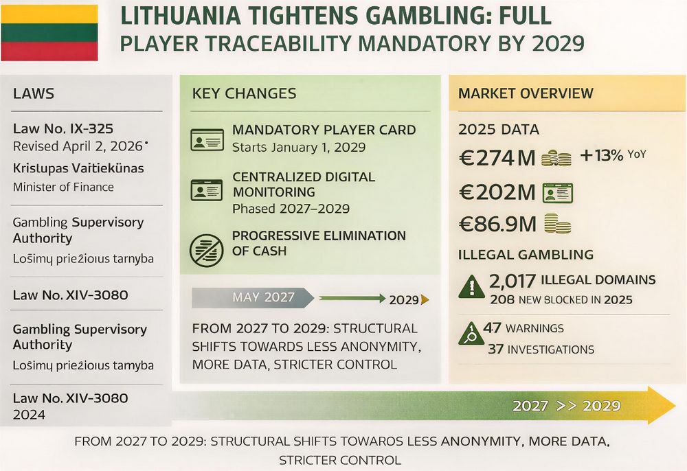 On April 7, 2026, it was disclosed that on April 2, 2026, Lithuania’s Ministry of Finance, led by Kristupas Vaitiekūnas, introduced a reform to the Law on Gambling (Lietuvos Respublikos azartinių lošimų įstatymas, Law No. IX-325) that will require all players to use a mandatory player identification card starting January 1, 2029, while progressively eliminating cash and centralizing market oversight.